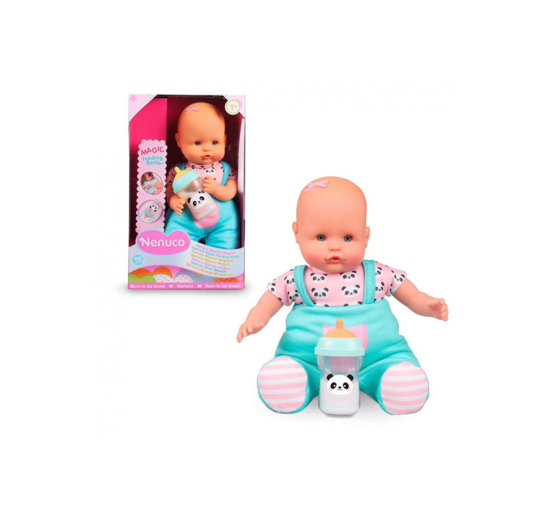 Bambola Nenuco morbida con biberon magico e un simpatico vestitino a tema panda. Mentre beve...