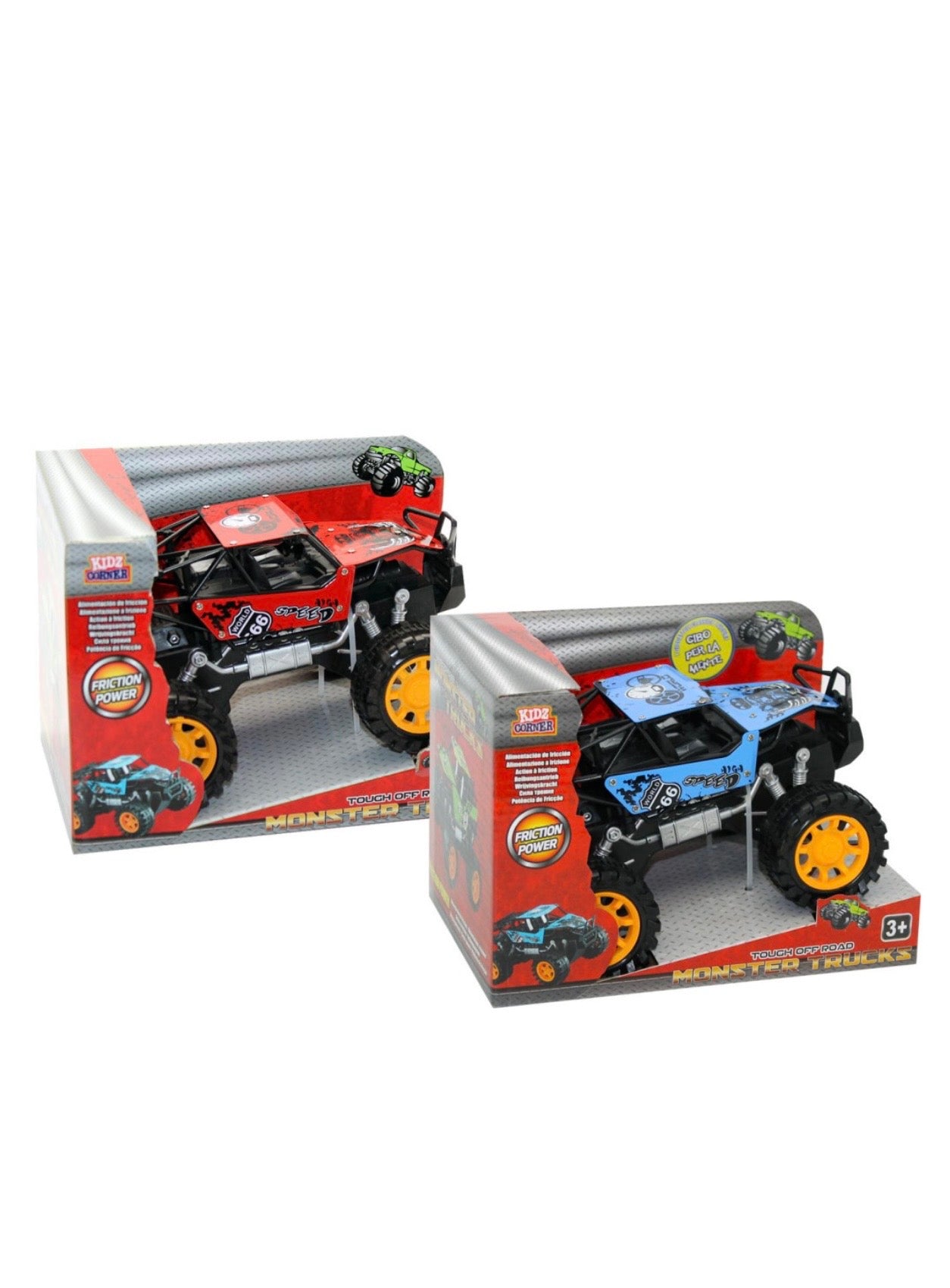 Auto Monster Trucks lunga 22 centimetri, con funzionamento a frizione. Parti in metallo. Disponibile in due colori, azzurro e rosso.