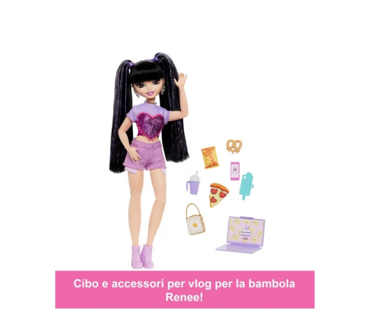 - 💇♀️ Capelli unici - Renee sfoggia lunghi capelli neri raccolti in codini con ciocche viola brillanti, per esprimere la sua personalità entusiasta e vivace!