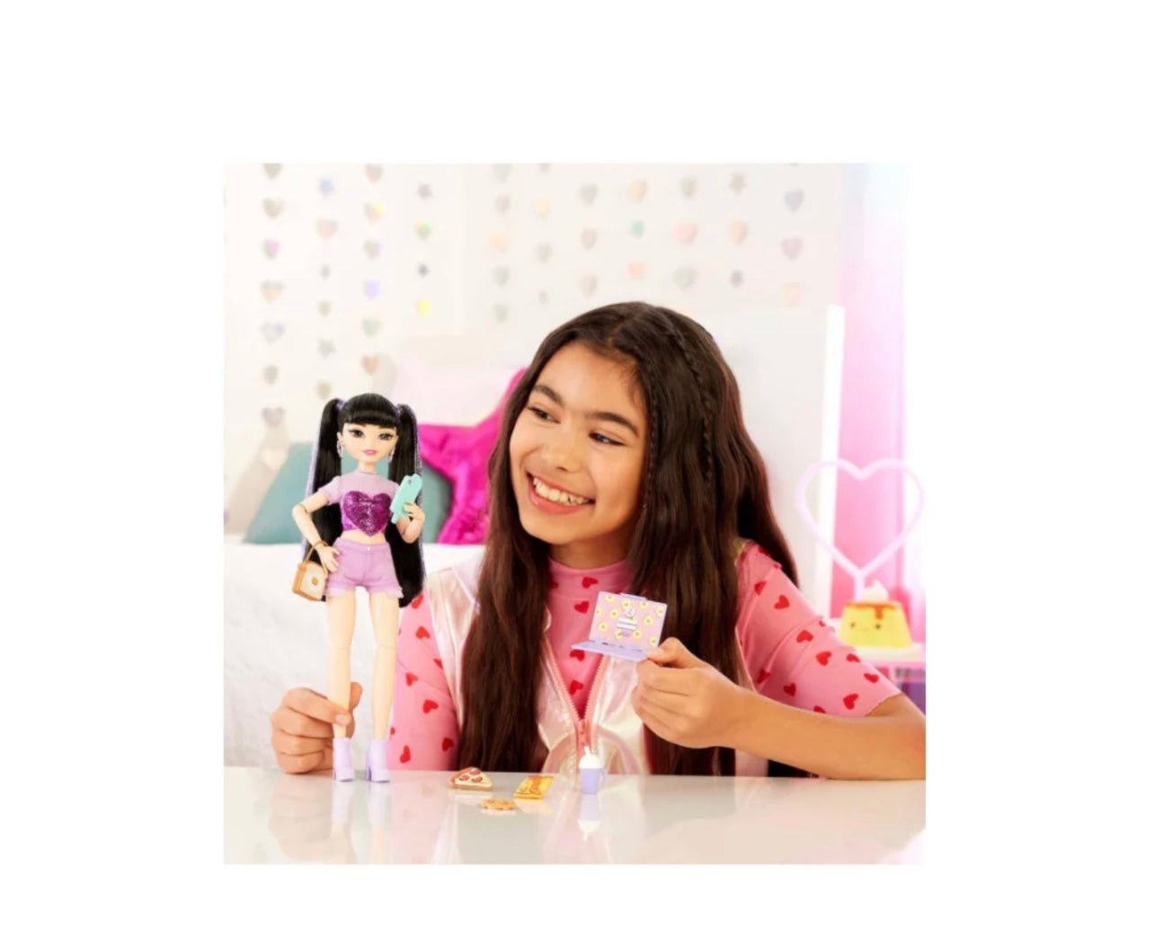 - 👗 Look alla moda - La bambola è snodabile e indossa abiti rimovibili, come un top corto scintillante con cuori viola, pantaloncini viola in denim e stivali, per uno stile moderno e accattivante.