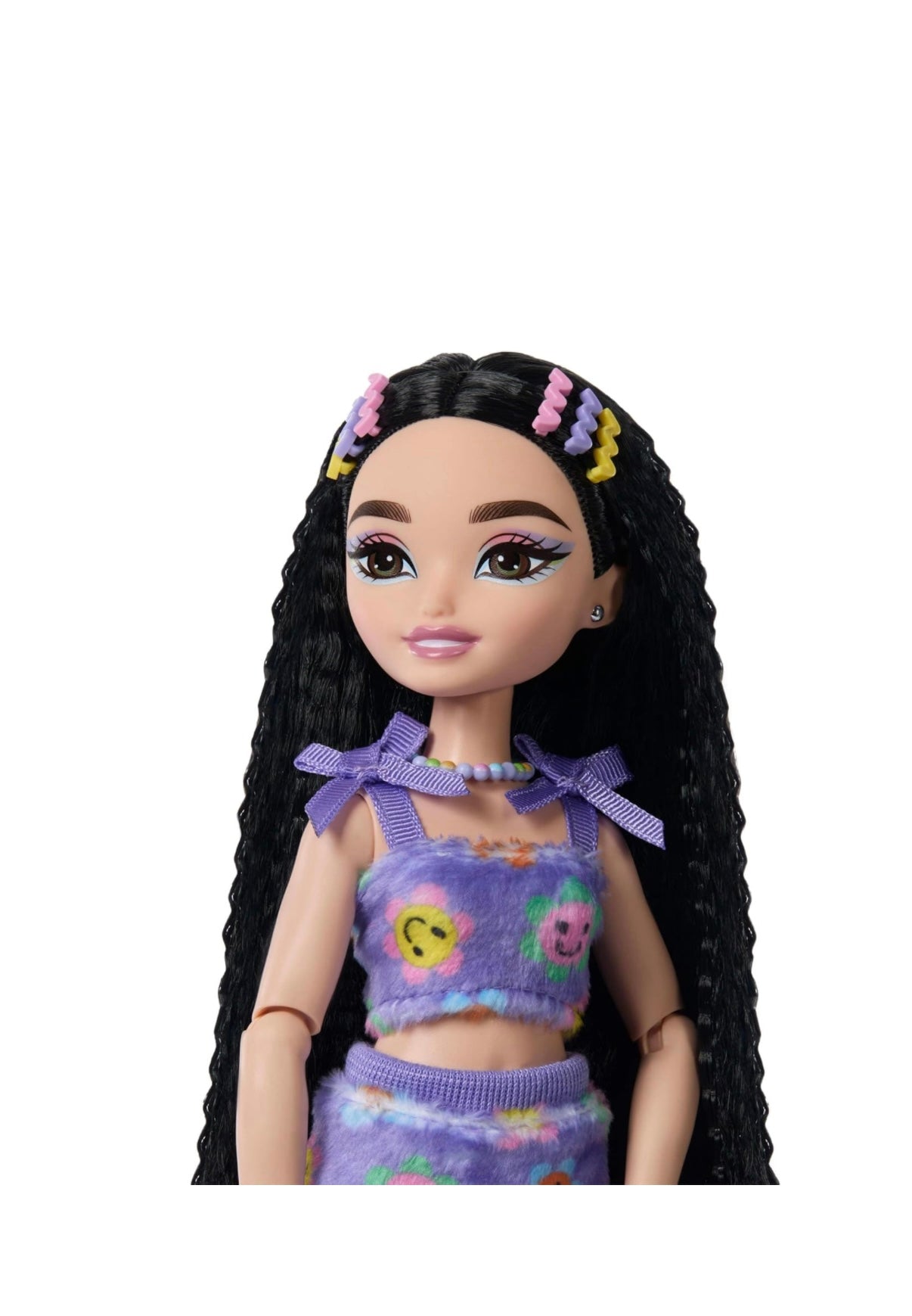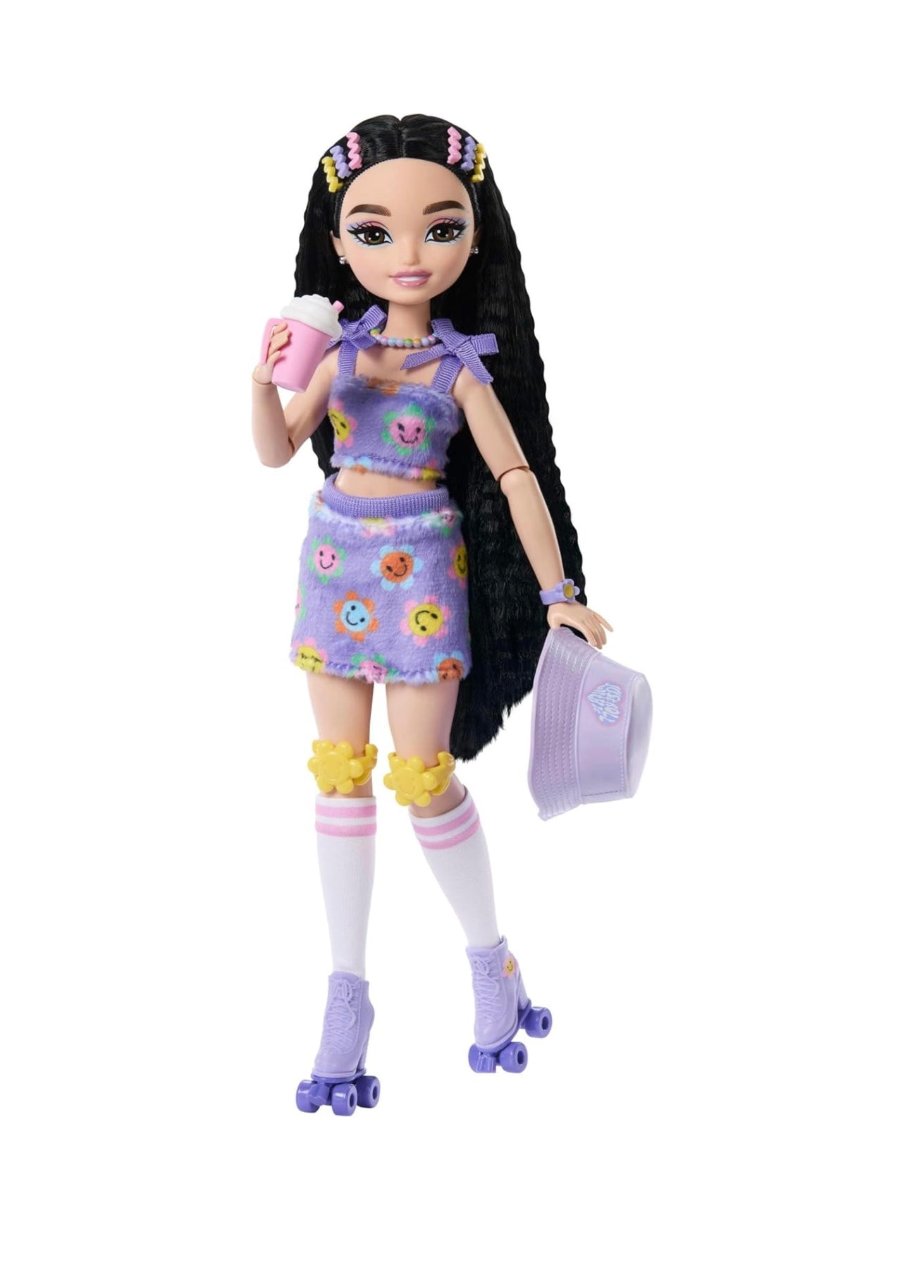 - La bambola è snodata e indossa abiti rimovibili, come la canotta e la gonna di pelliccia con motivi floreali, lunghe calze bianche a strisce rosa e pattini a rotelle viola coordinati con dettagli floreali
