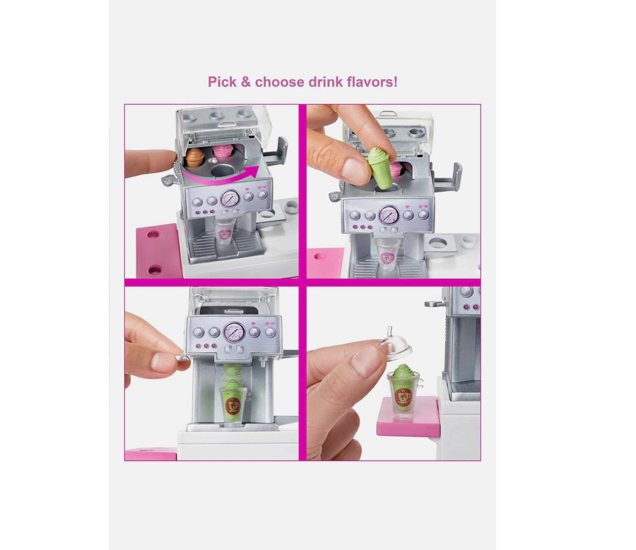 - Con un look composto da graziosa camicia a righe, grembiule rosa e acconciatura raccolta sportiva, Barbie prepara caffè, frullati e e tè per i suoi clienti (gira la manopola sulla macchinetta per scegliere il giusto della tua bevanda preferita)