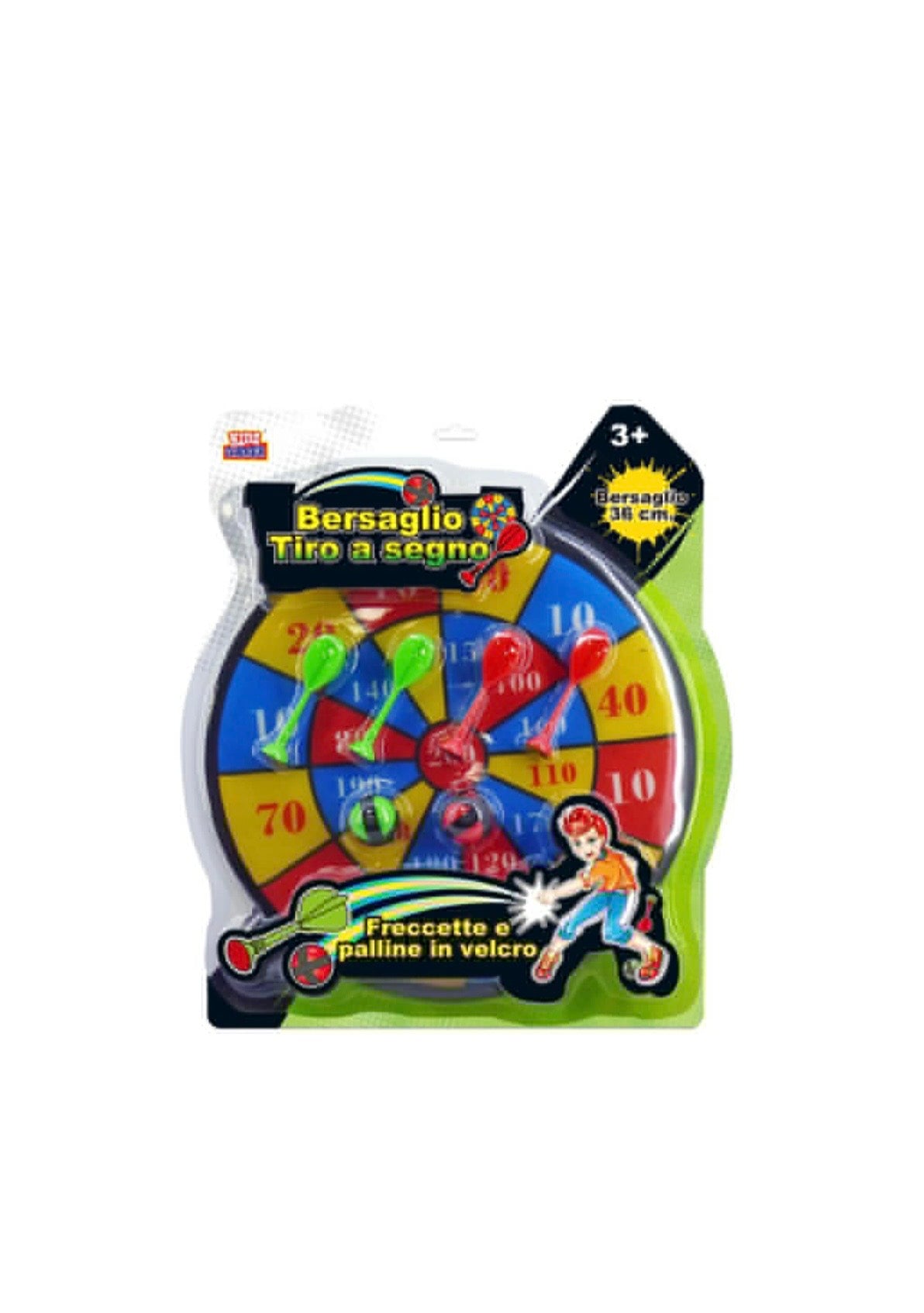 Bersaglio in velcro con freccette sicure.La confezione contiene un tabellone, quattro freccette e due palline.