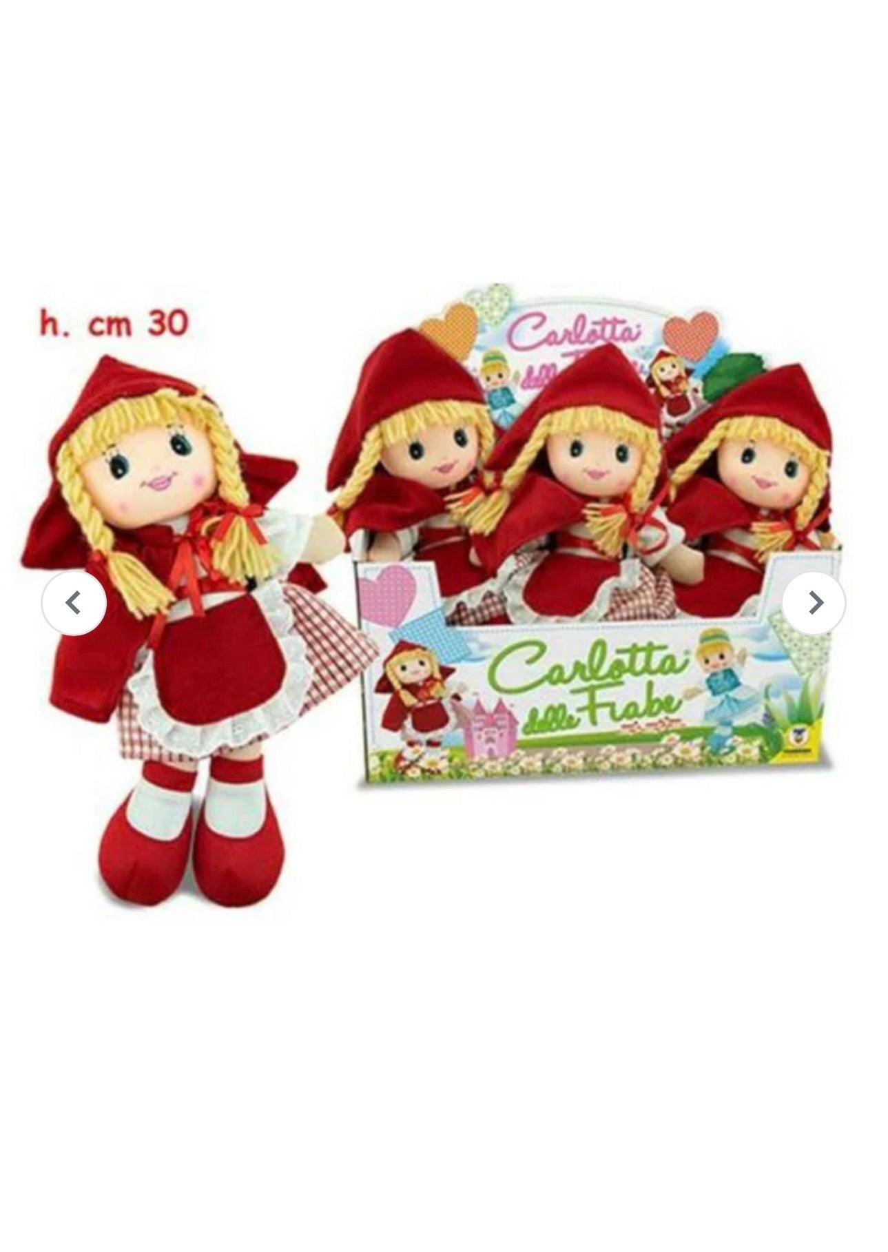 Bambola di pezza di cappuccetto rosso. Dimensioni: 30 cm