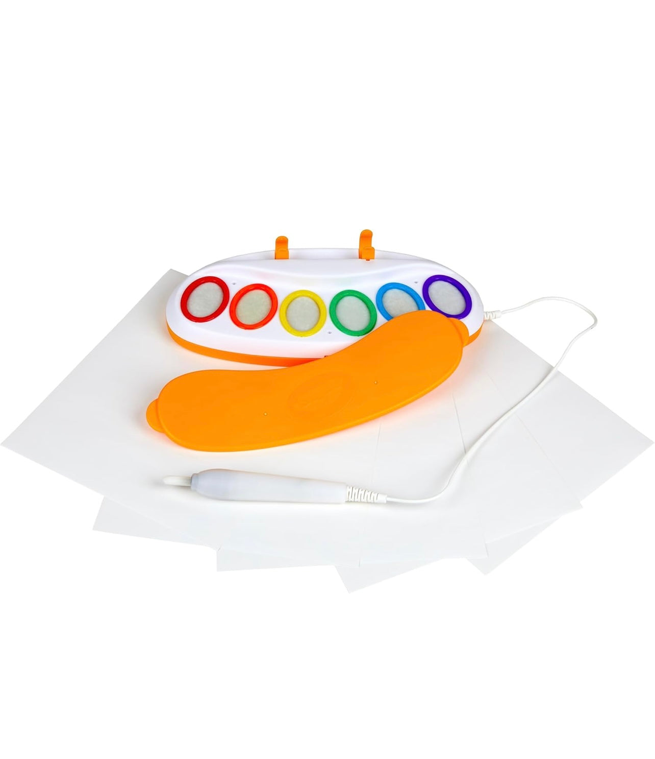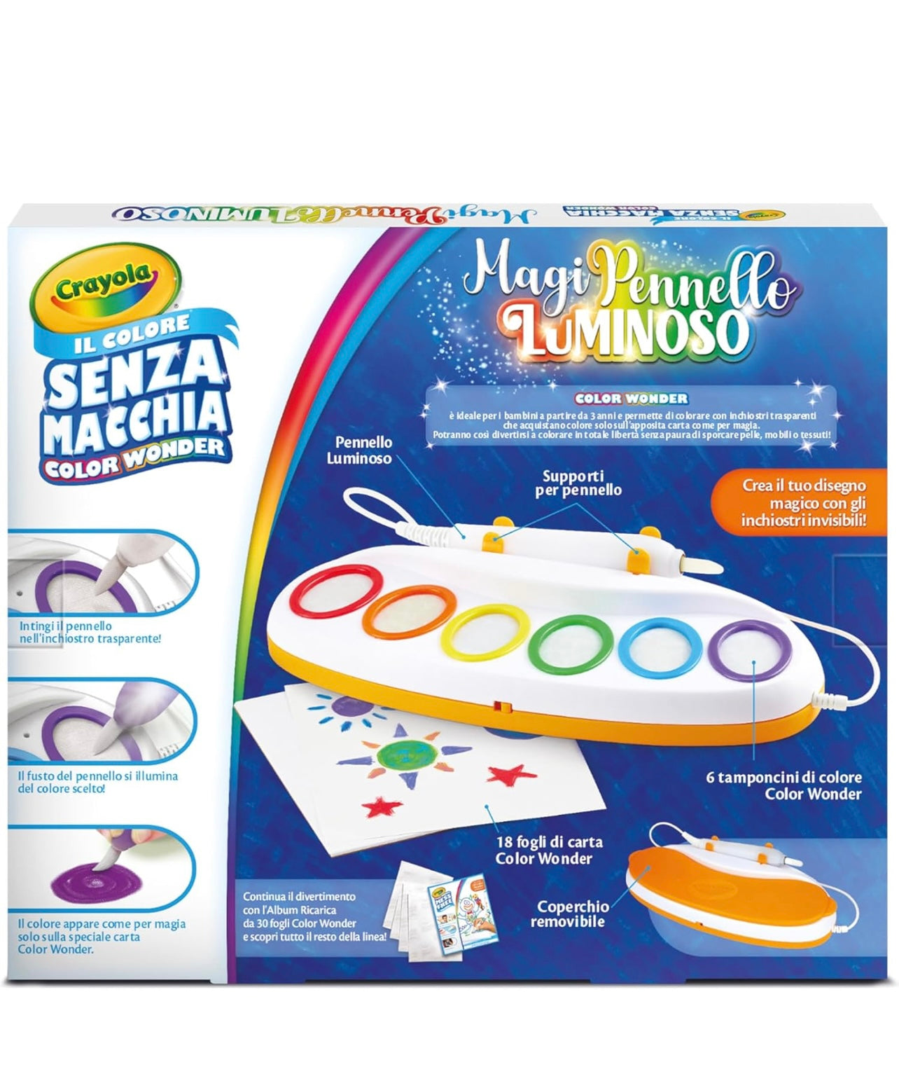 - Set tempere senza macchia con pennello luminoso e 6 tamponcini di colore: dipingere sarà una vera magia perché le tempere sono trasparenti ma acquistano colore solo a contatto con la speciale carta Color Wonder - versione italiana