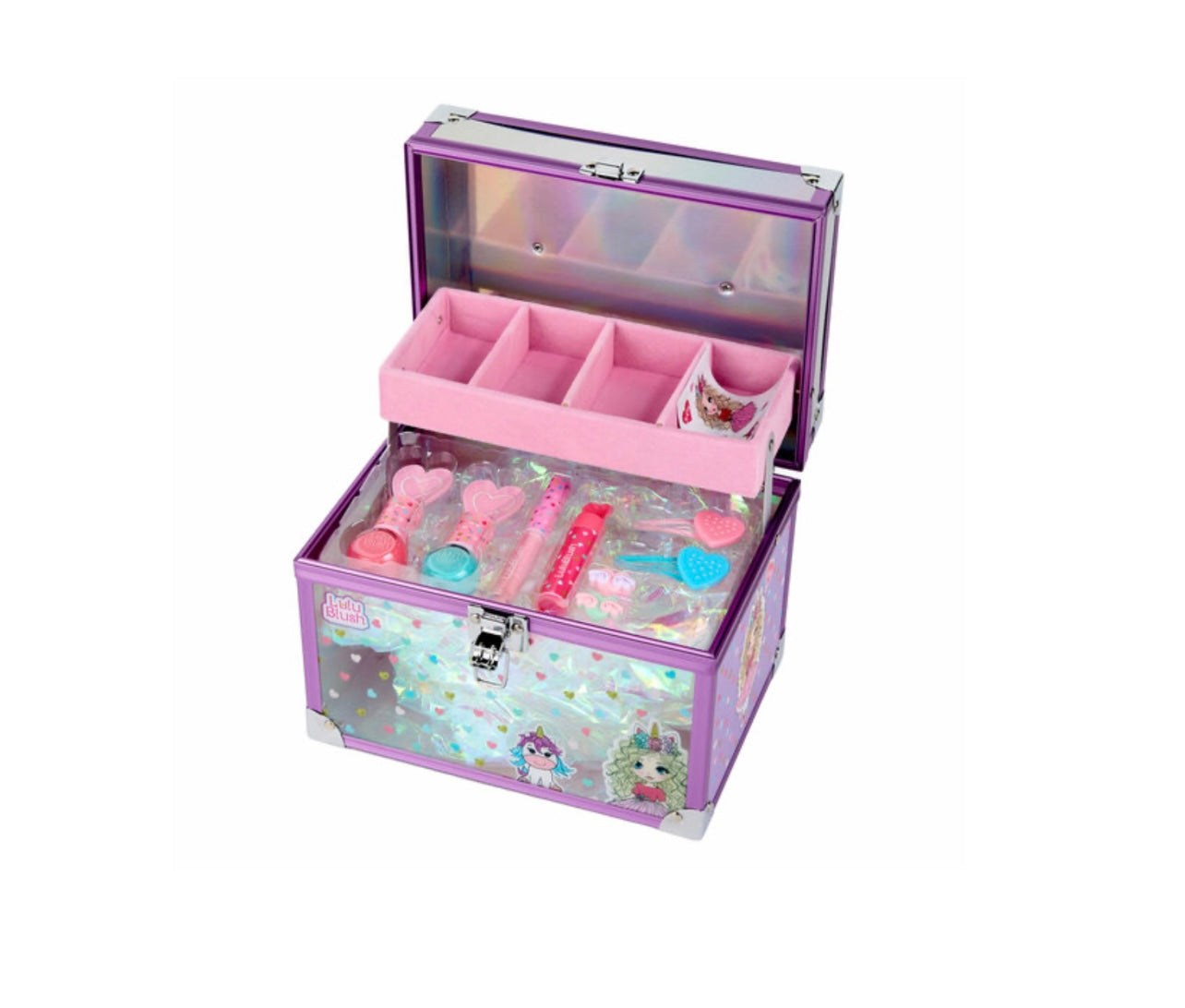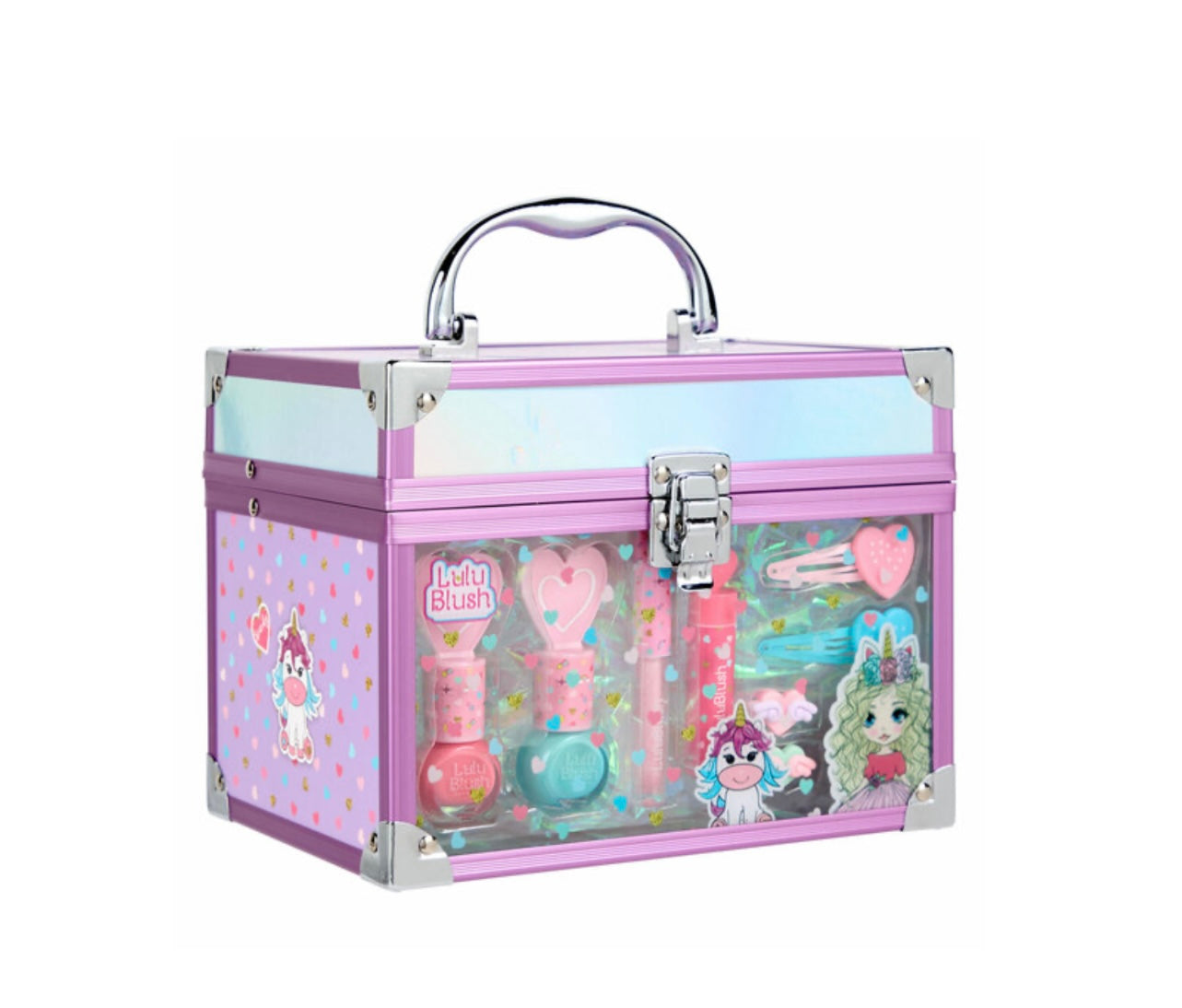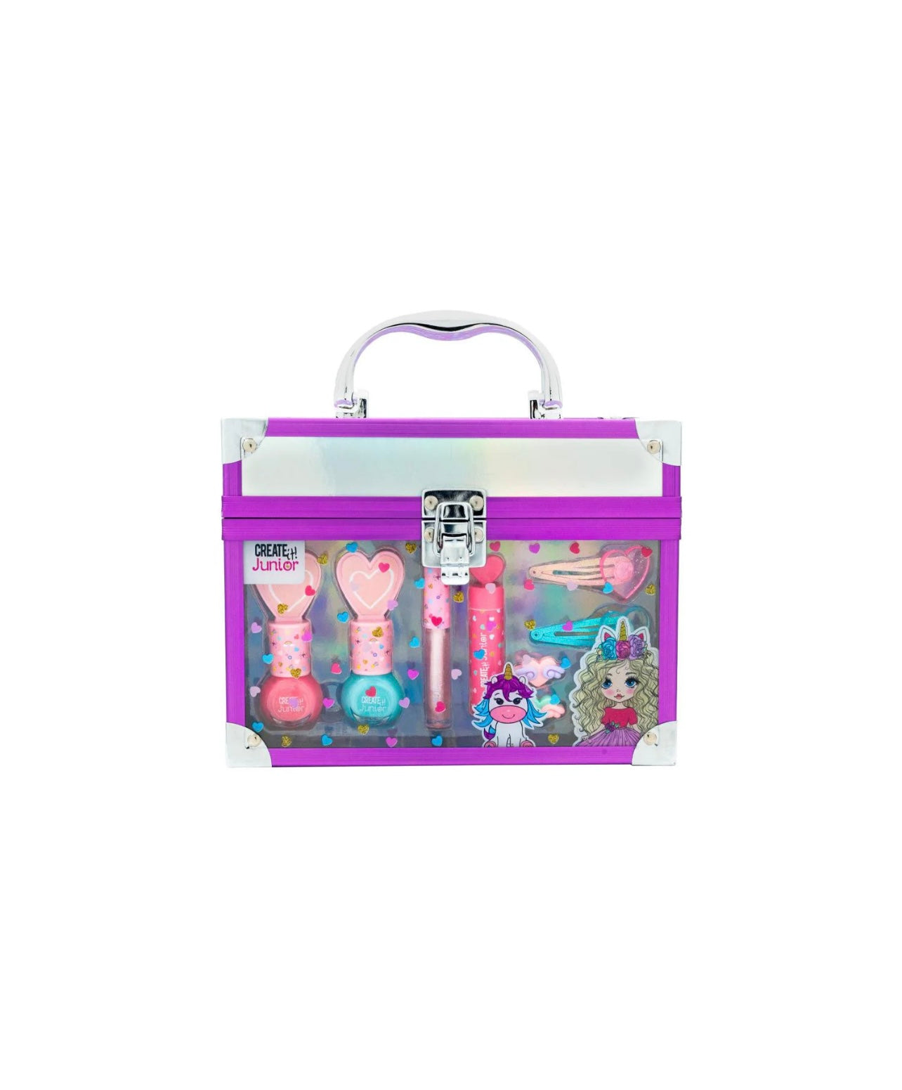 Il Create it! set per il trucco in valigetta trasparente e' il pacchetto completo per soddisfare le tue esigenze di trucco. La custodia e' facile da portare con se' ovunque tu vada. All'interno smalti colorati, lip gloss, un rossetto leggero e accessori per i tuoi capelli.