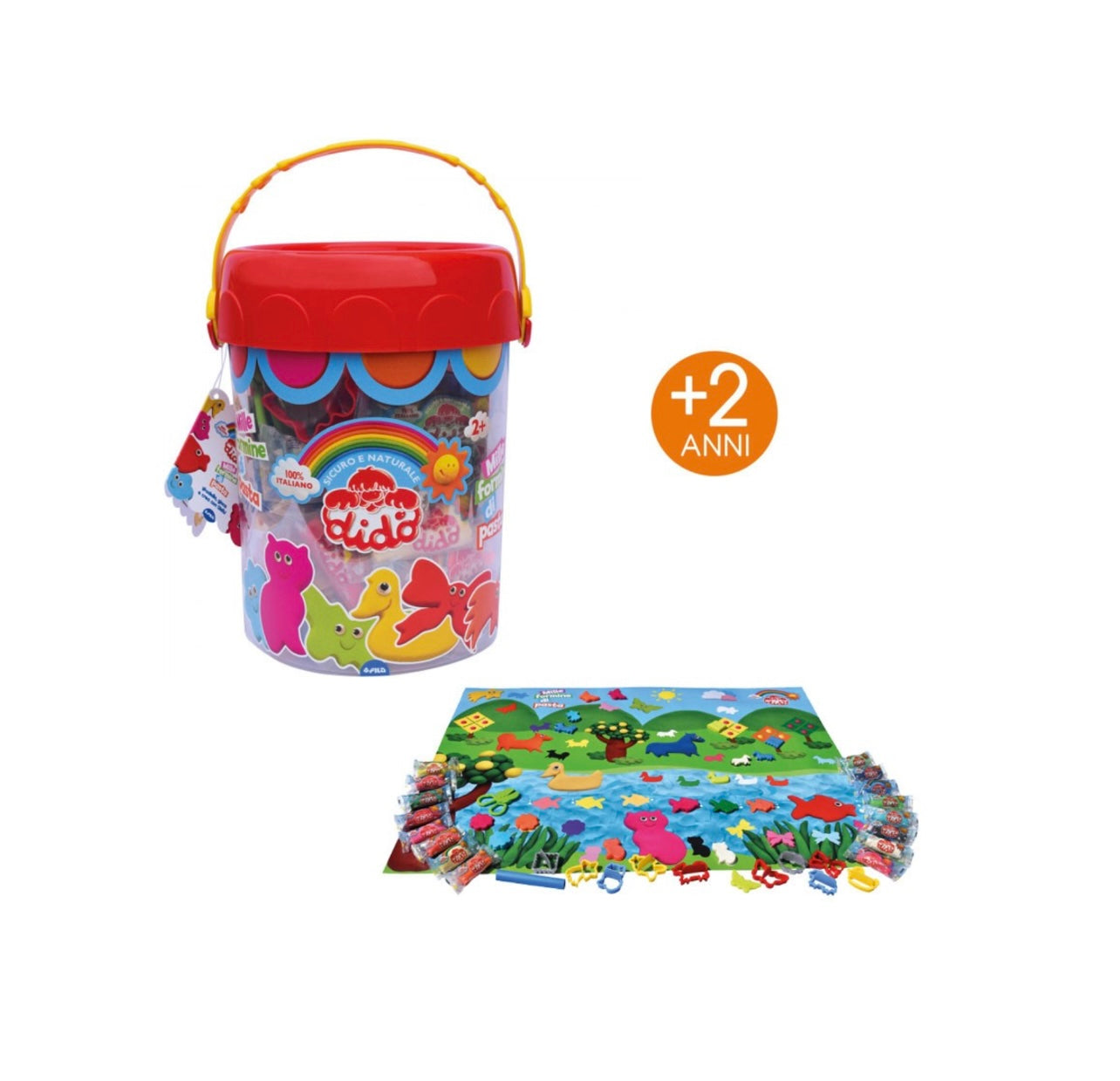 La famiglia di secchielli più amati dai bambini si arricchisce di un nuovo componente, il vaso Didò Mille Formine di Pasta. 800g di Didò nel maxi secchiello con formine, taglino e maxi tovaglietta tappetino per i piccolissimi. Contiene: 16 salsicciotti, 10 formine taglino: cane, farfalla, gatto, cavallo, oro saiwa, bucaneve, pesce, oca, stella, fiocco, 1 coltellino, 1 mattarello, 1 forbicine, 1 maxi tovaglietta 1mt x 70cm