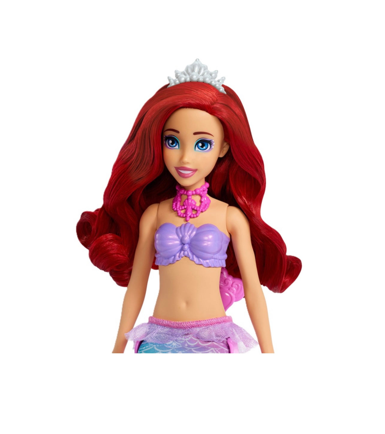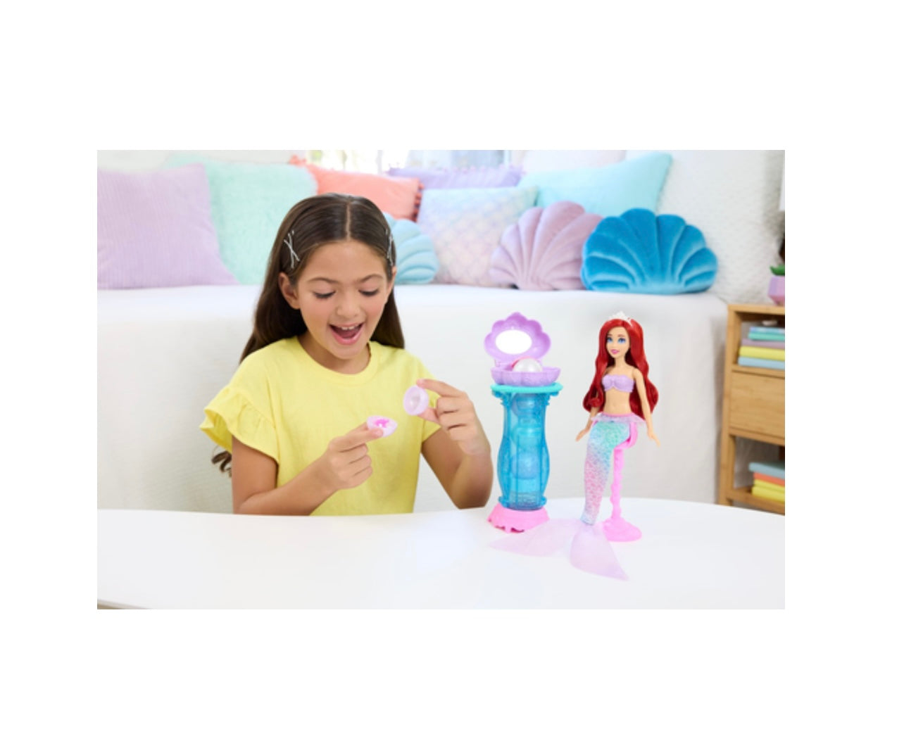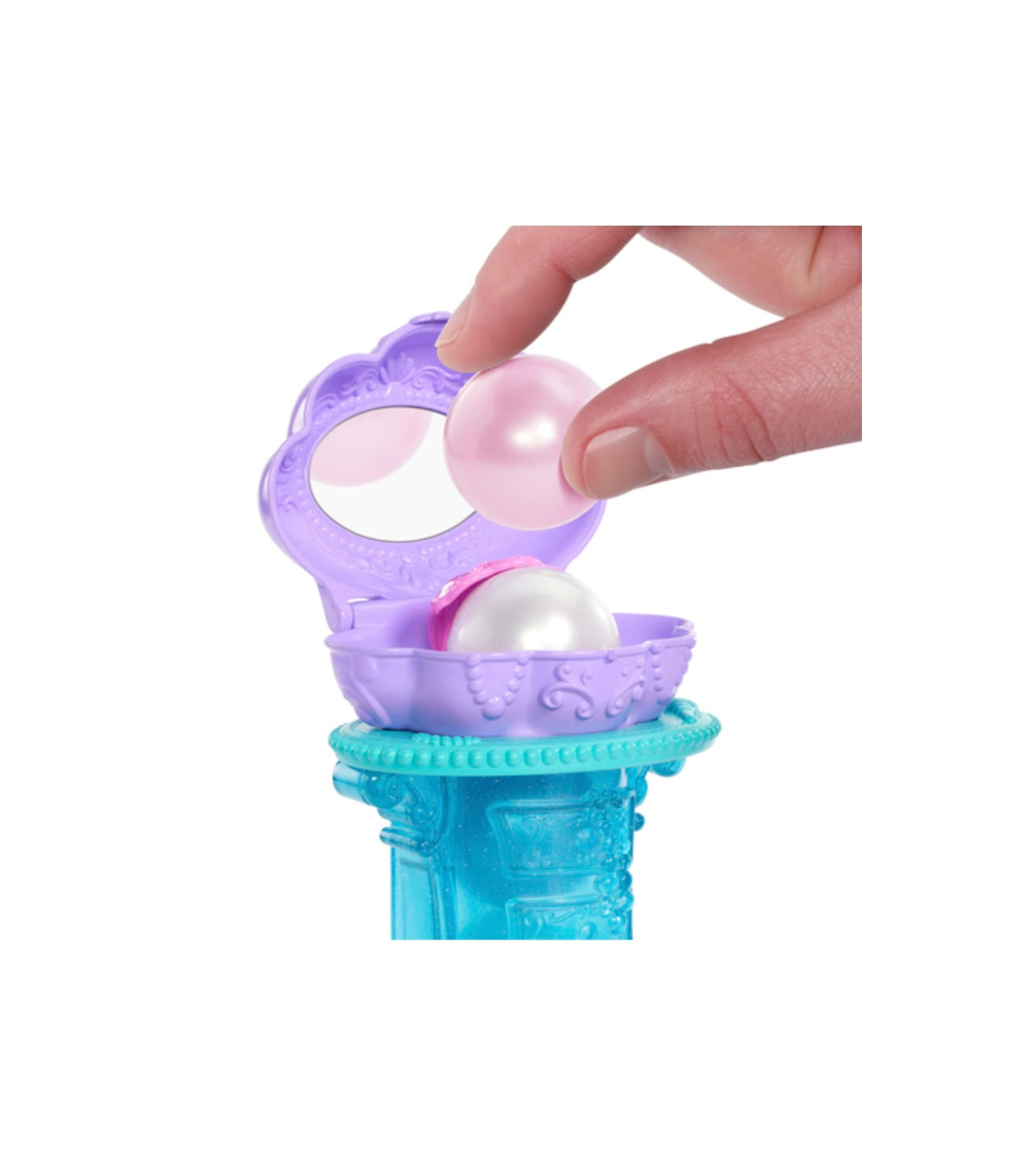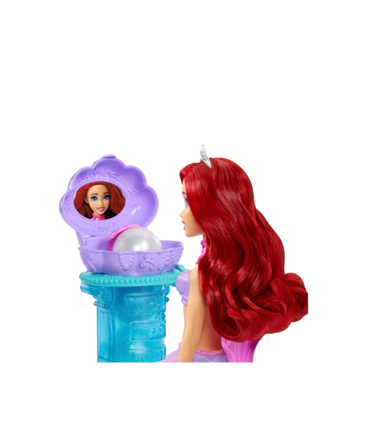 La magia delle sirene non finisce mai con la Sorpresa Sirena Principessa Disney di Mattel! Ispirata al film Disney "Ariel, la sirena", la fashion doll di Ariel si prepara per la sua avventura in toeletta. Grandi sorprese vi aspettano. Nella parte superiore della toeletta, appare una perla con un accessorio a sorpresa. Quando la perla viene rimossa, il tesoro all'interno viene rivelato e al suo posto appare una nuova perla. Il guscio può essere ricaricato in modo che questa bambola Ariel con toeletta, specchio e accessori possa vivere sempre nuove avventure a terra e sott'acqua.