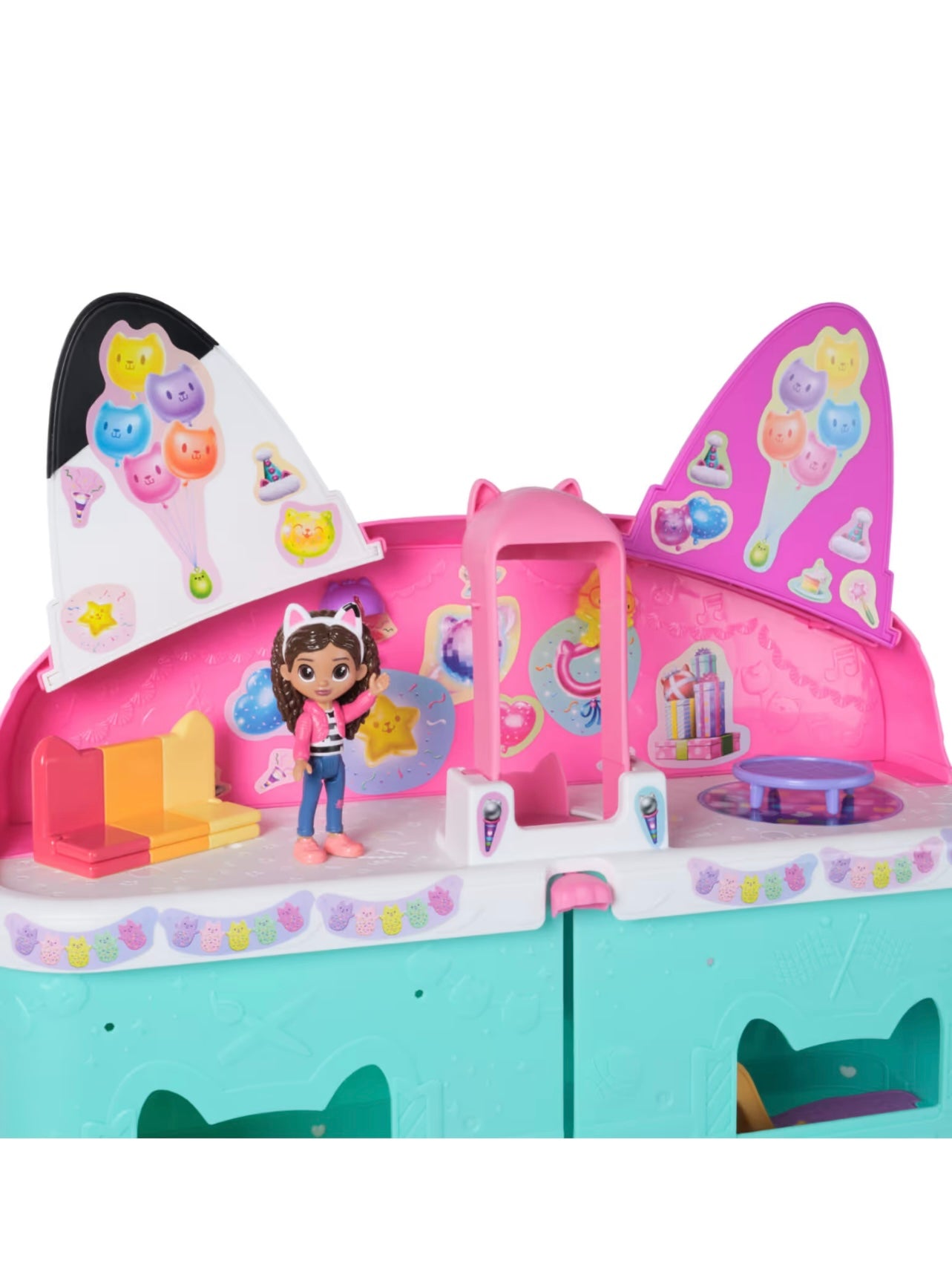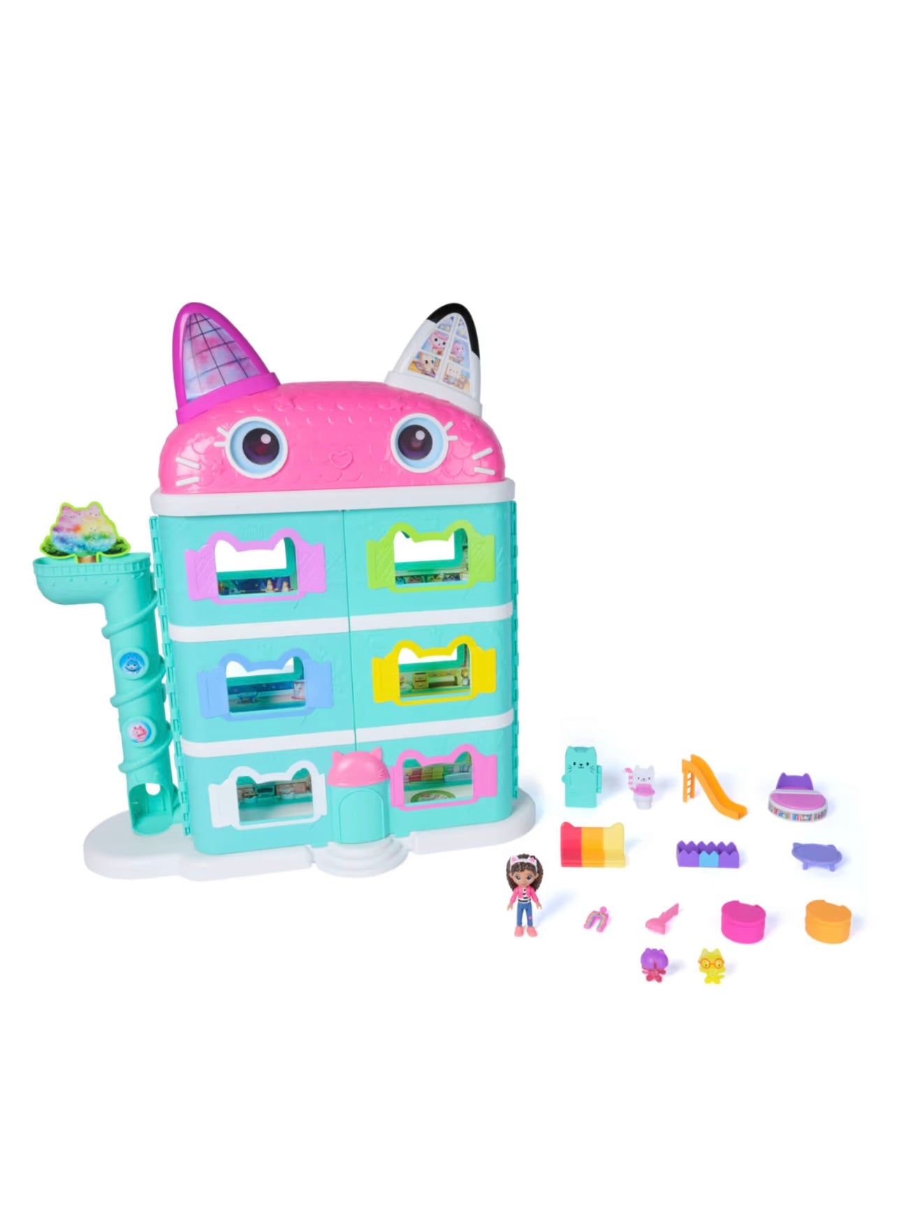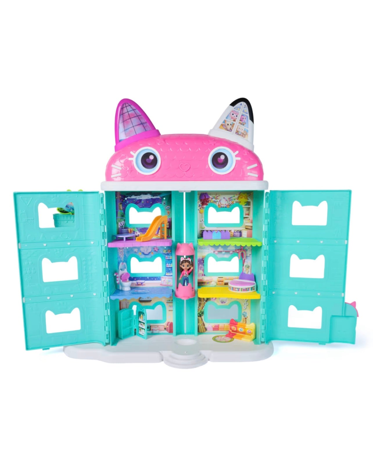 La casa delle bambole ufficiale del film di Gabby Vivi le emozioni di Gabby's Dollhouse: The Movie con la nuova Meow-Mazing Dollhouse, alta oltre 60 cm, con occhi lenticolari animati e stanze piene di sorprese per un gioco magico e interattivo.7 ambienti e 1 stanza delle feste Scopri 6 stanze gattastiche e una sala party all'ultimo piano. Esplora ogni livello usando il simpatico Cat-ascensore e ricrea le scene del film con un'esperienza immersiva e divertente. Mini personaggio Gabby incluso Il set contiene una mini figura di Gabby in versione esclusiva Movie, con la sua fascia orecchie da gattina, pronta per tante avventure nella sua fantastica casa delle bambole. Accessori e sorprese da scoprire Troverai 7 mobili, 5 accessori e 2 fogli di adesivi per personalizzare ogni stanza. Inoltre, apri le consegne misteriose e scansiona il QR code per contenuti digitali interattivi nell'app ufficiale. Compatibile con tutta la linea Gabby's Dollhouse Espandi il divertimento con stanze e balconi aggiuntivi (venduti separatamente). Tutto si integra perfettamente per creare un mondo di gioco ancora piu' grande. Gioco educativo e interattivo 3+ anni Stimola immaginazione, motricita' fine e gioco simbolico. Ideale dai 3 anni in su, per un divertimento sicuro e coinvolgente, sia da soli che in compagnia. Con effetti sonori e valigetta richiudibile L'esperienza e' completa con effetti sonori integrati e una struttura compatta e richiudibile. Portala ovunque e gioca dove vuoi!
