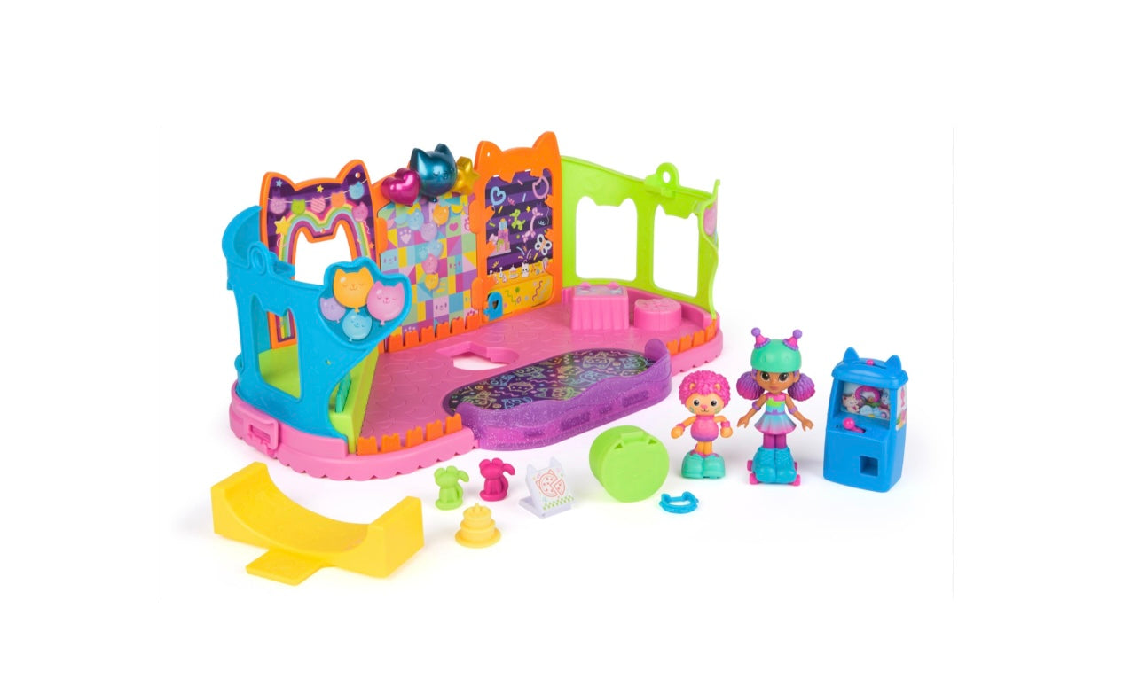 - STANZA DEI GIOCHI E PISTA DI PATTINAGGIO: L’attico di Gabby è dotato di rampa, palco e pista di pattinaggio. Include accessori e i personaggi Gabby e Marty, il gatto della festa, con pattini funzionanti