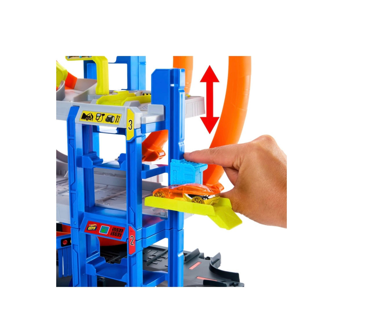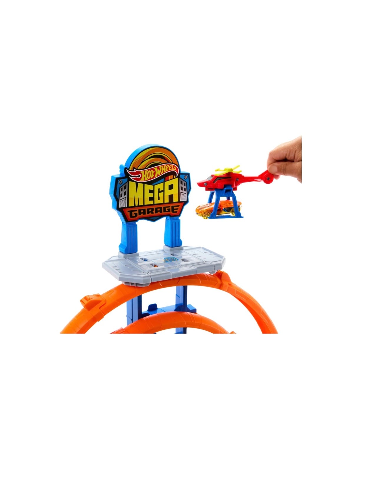 Il playset Hot Wheels City Mega Garage presenta tre livelli di gioco con macchinine a spinta per coinvolgere i giovani piloti in storie creative e acrobazie epiche. Il piano base di questo set multilivello consente ai bambini di guidare la macchinina attraverso un autolavaggio dotato di un rullo mobile e di una tenda. Inserisci la macchinina nel lanciatore e lanciala nel doppio loop; i deviatori la indirizzeranno verso il piano desiderato. Utilizza un ascensore azionato manualmente o l'elicottero che trasporta le macchinine e le parcheggia. Amplia il gioco utilizzando i connettori Speed Snap Track. Include una macchinina Hot Wheels die-cast e un elicottero giocattolo. Veicoli e piste aggiuntive in vendita separatamente. Colori e decorazioni possono variare.