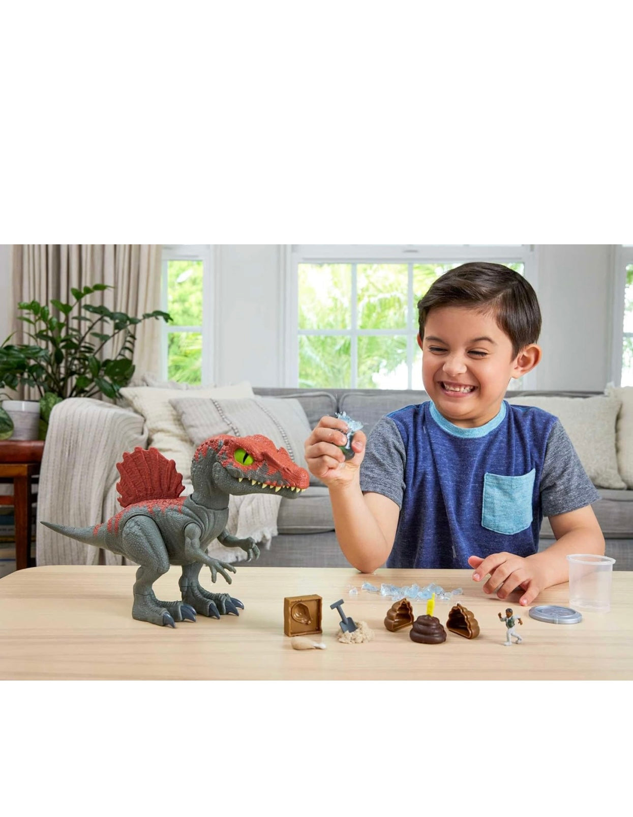 - SALVATAGGIO! Questa confezione è pronta per un'avventura ricca di azione. Trova la guida della giungla e scopri il telefono satellitare nascosto prima che sia troppo tardi! Lo Spinosauro può trasformare i più lenti in escrementi di dinosauro!