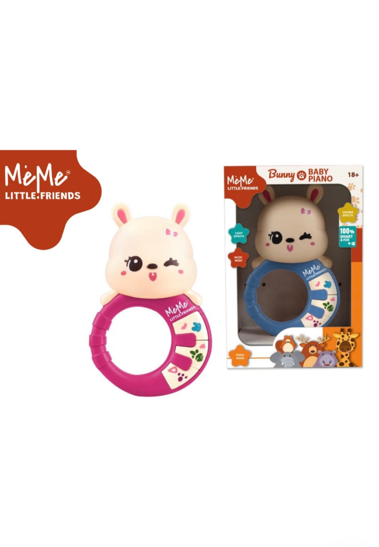 La linea Little Friends nasce e si sviluppa attorno al meraviglioso concetto di amicizia tra bambini ed animali, con un senso di divertimento istintivo ed intelligente. Forme semplici ma colorate e vive. Niente mai e' stato piu' educativo ed interessante per un bambino della vicinanza al mondo degli animali. Il coniglio Bunny con la testa in gomma e' un piano elettronico per i primi mesi con luci, suoni ed effetti. Batterie in dotazione.