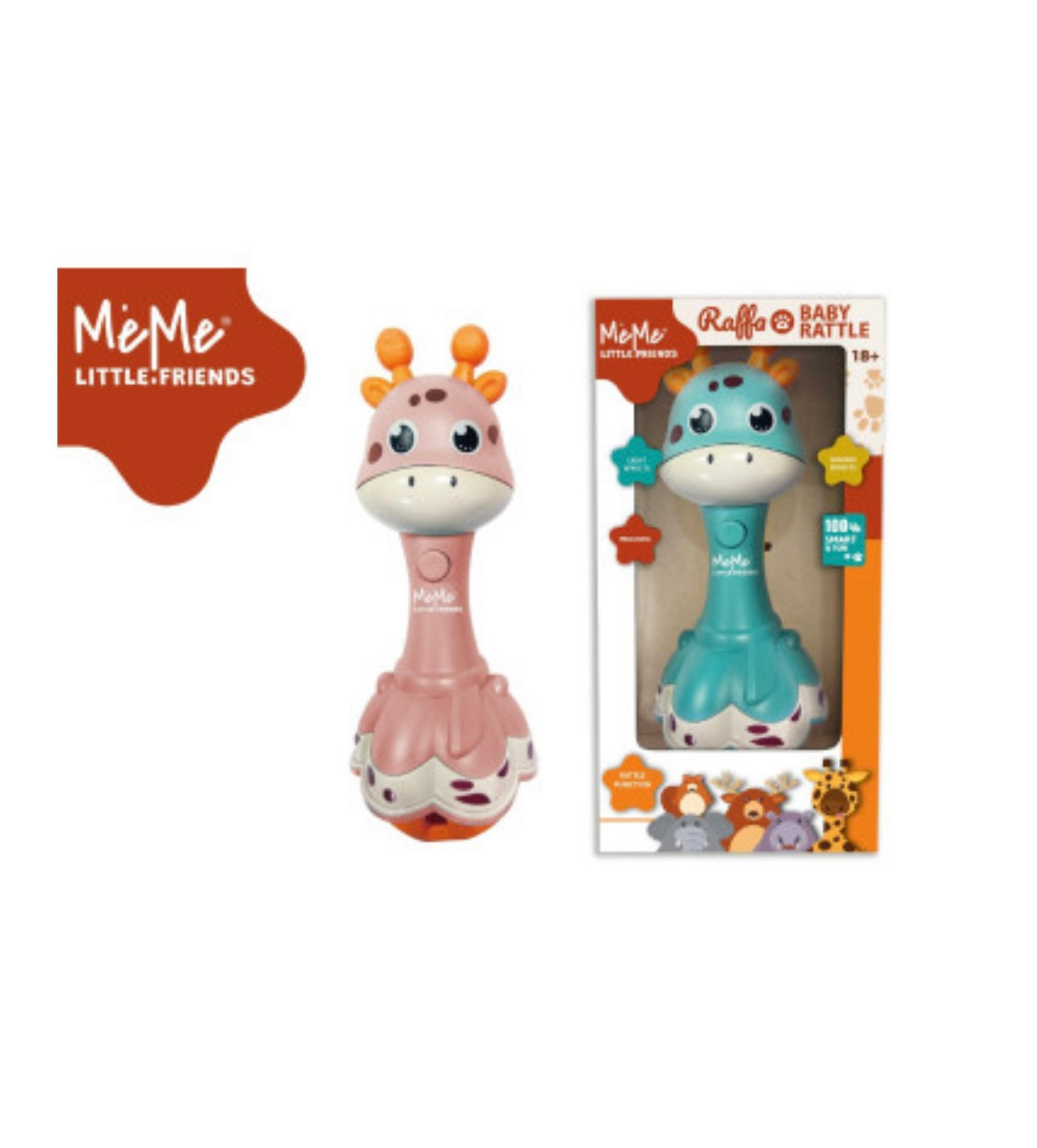 La linea Little Friends nasce e si sviluppa attorno al meraviglioso concetto di amicizia tra bambini ed animali, con un senso di divertimento istintivo ed intelligente. Forme semplici ma colorate e vive. Niente mai e' stato piu' educativo ed interessante per un bambino della vicinanza al mondo degli animali. La giraffa Raffa e' un sonaglio elettronico per i primi mesi con luci, suoni ed effetti. Batterie in dotazione.