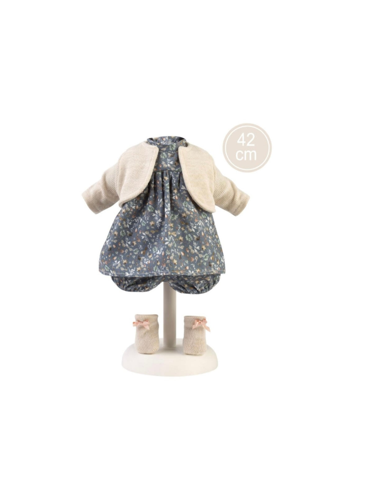 Set per la tua Llorens lungo 42 cm, composto da un vestito grigio, un cardigan, mutandine e calzini con fiocchetto