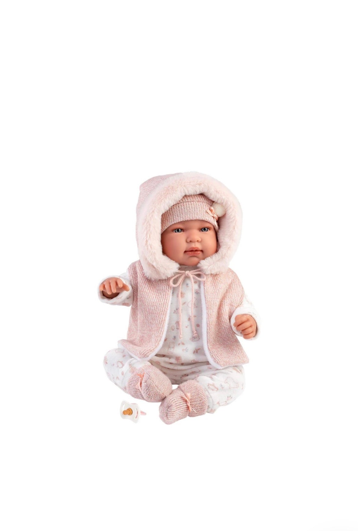 Tina e' una delle nostre neonate piu' grandi. Ha gli occhi azzurri ed e' avvolta nella sua felpa con cappuccio e nella sua tutina rosa. Ha un corpo morbido con arti in vinile