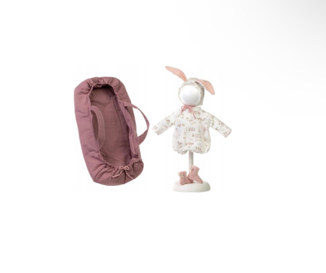 Completo rosa e bianco per bambole Llorens composto da tutina lunga e intera con cappuccio e simpatiche orecchie da coniglio e stivaletti. Un pratico porta enfant e' incluso della confezione