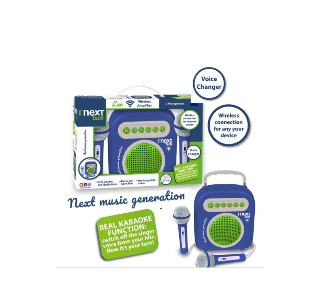 Amplificatore wireless con 2 microfoni. Karaoke con funzione ON/OFF della voce originale. Presa per ascoltare musica/audio da USB Drive, da micro SD card e da device esterno utilizzando la connessione. Regolazione volume e tasti di selezione brano precedente/successivo. Presa micro USB per cavetto di carica (incluso).