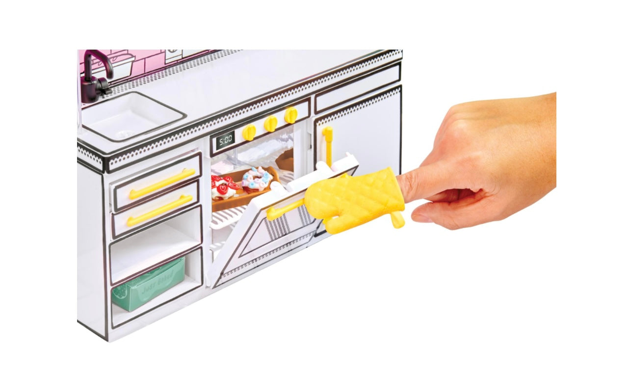 COSA INCLUDE: Questo set comprende un forno, un frigorifero, un piano di lavoro e ripiani. Inoltre, include 2 ricette, ingredienti misteriosi e 2 esclusivi guanti da forno, reperibili solo in questo set Kitchen.
