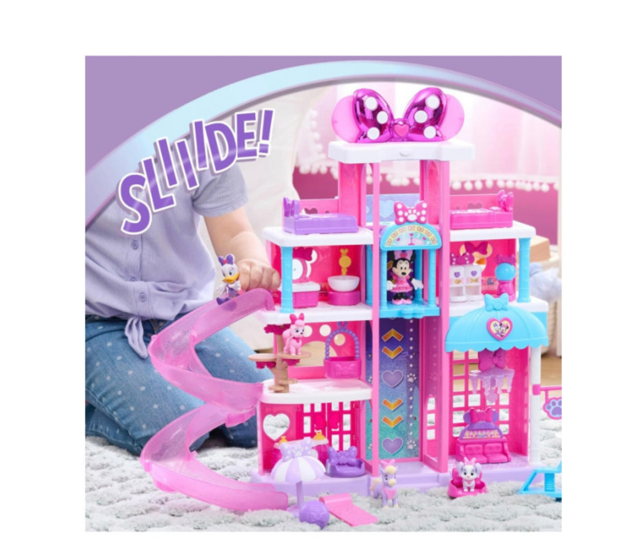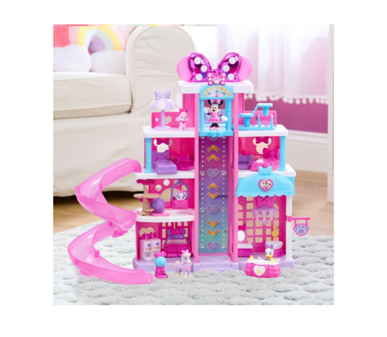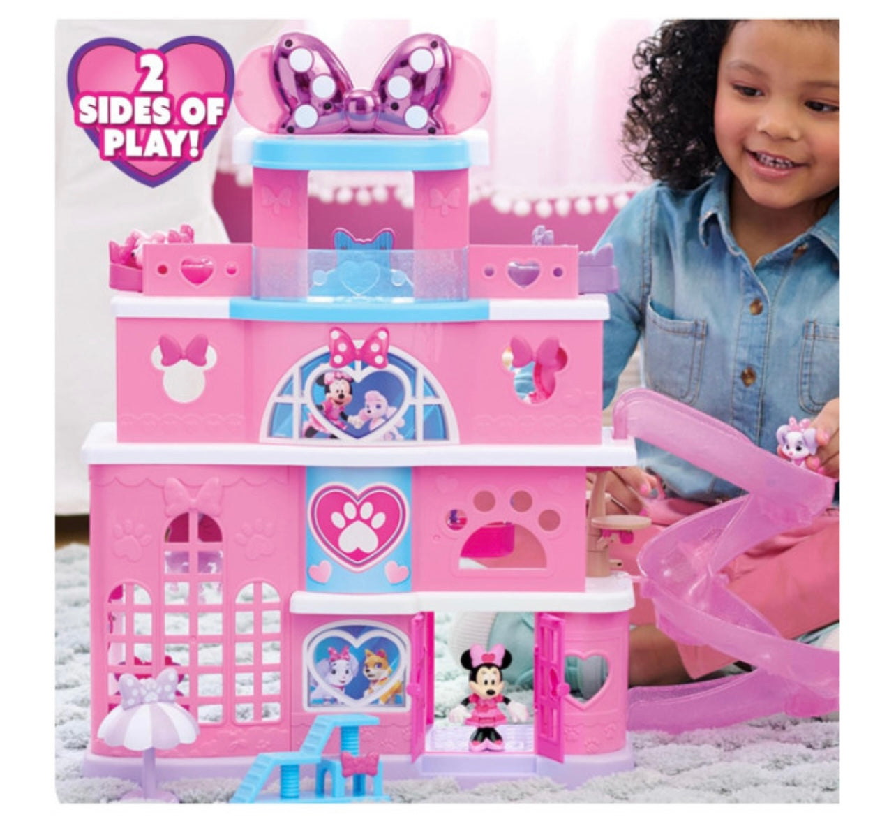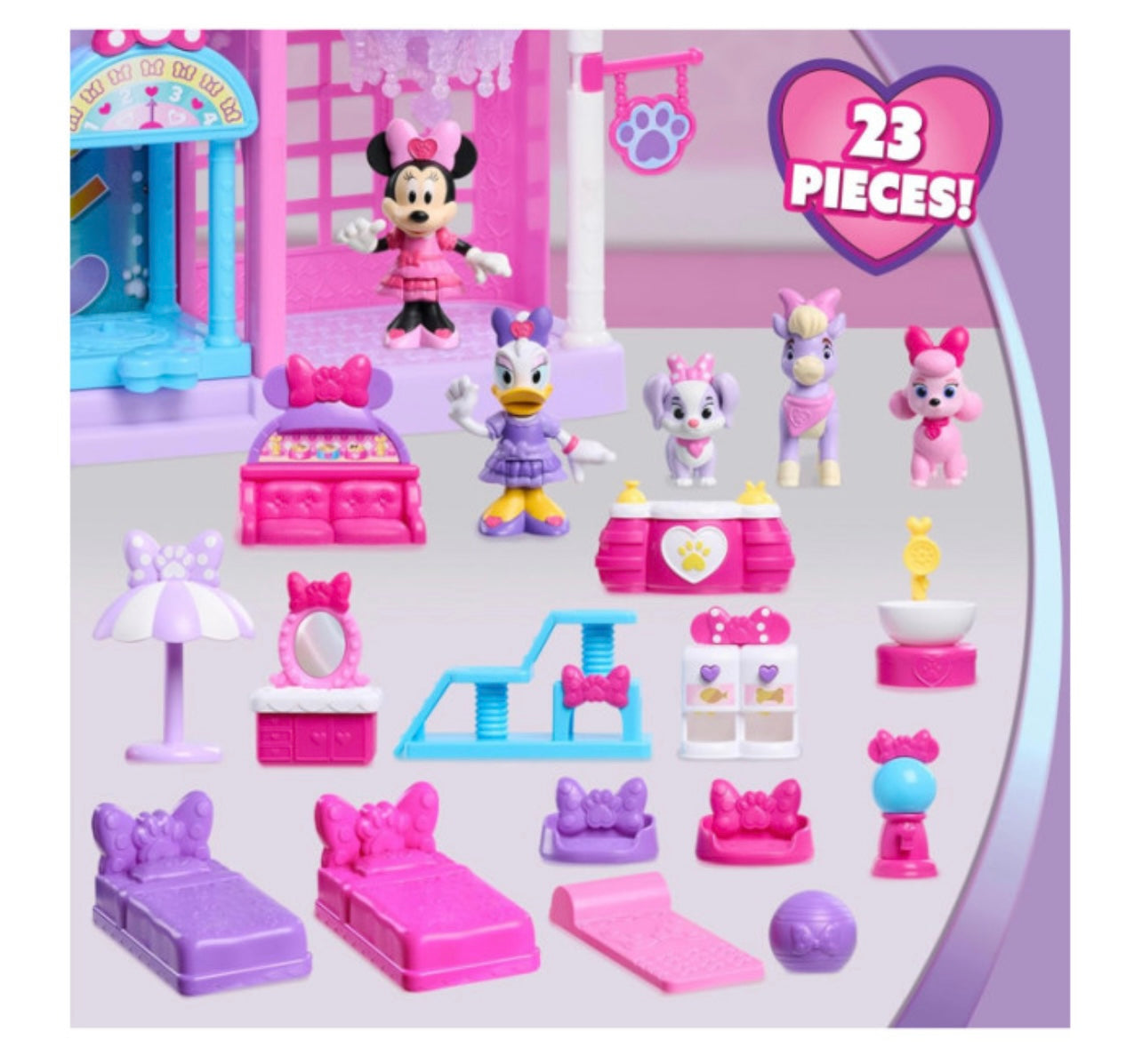 - Include: set da gioco, scivolo, fiocco elettronico, personaggi snodabili di Minni e Paperina, 3 cuccioli, scrivania, set da pranzo, distributori di cibo e acqua, torre per animali, altalena, toletta, vasca da bagno, 2 letti, 2 cucce, tappetino da yoga, palla, ombrellone