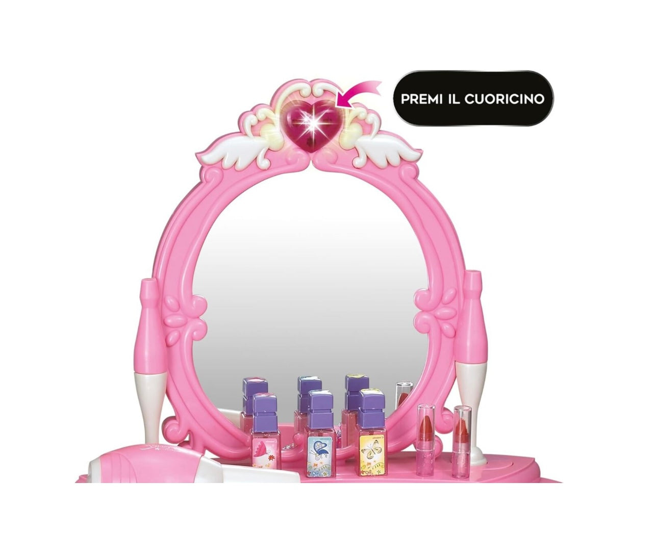 - SPECCHIERA LUCI E SUONI: Premi il pulsante a forma di cuore posto nella parte superiore della specchiera per creare un'atmosfera magica caratterizzata da luci e melodie.