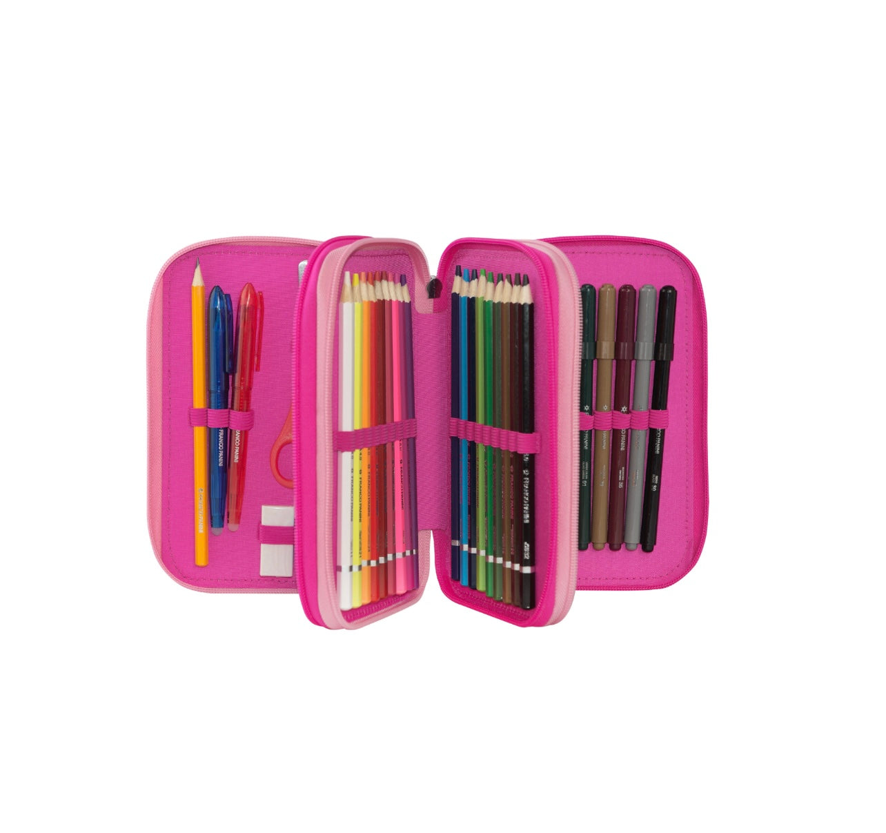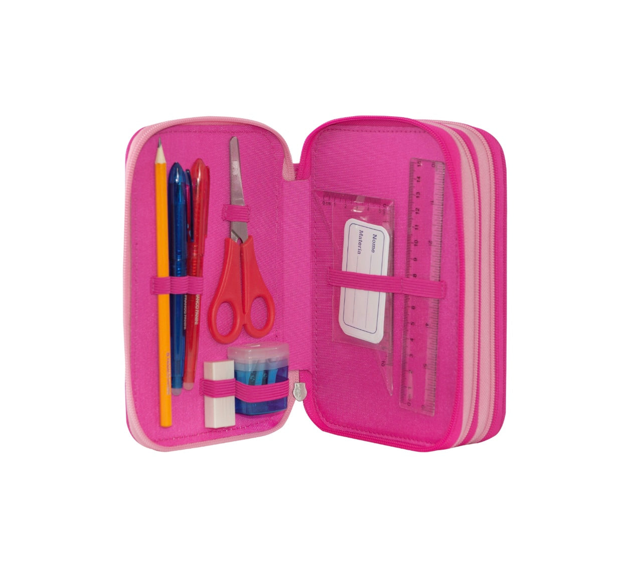 18 matite colorate – 18 pennarelli a punta fine – 1 penna cancellabile blu – 1 penna cancellabile rossa – 1 matita grafite HB – gomma – 1 righello 15 cm – 1 squadra – 1 paio di forbici con punta arrotondata – 1 temperino 2 fori con serbatoio – 5 etichette portanome adesive 7 x 3 cm.
