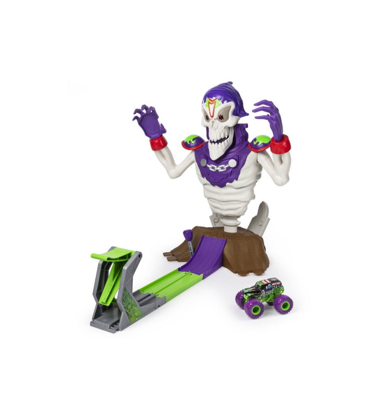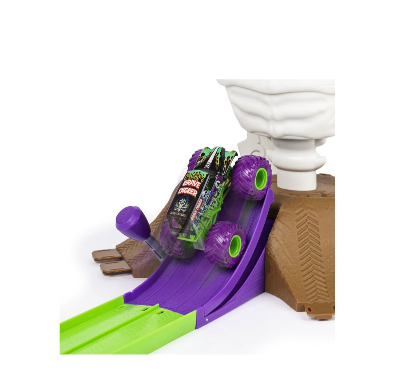 Questo set di Grim Takedown di Monster Jam vede una battaglia testa a testa definitiva tra il serio minivan scavatore e il temibile Grim. Posiziona l'esclusivo monster truck in scala 1:64 nel launcher, poi lancialo lungo i binari per una fantastica sfida ma fai attenzione, per sconfiggere questo minaccioso mostro, dovrai colpirlo più di una volta, infatti dovrai lanciare il tuo macchinina lungo il percorso almeno 3 volte direttamente sul petto di Grim. Mira verso l'alto o verso il basso, in ogni caso, sarà sicuramente un colpo devastante, ora preparati per il finale, lancia il tuo Monster truck direttamente sulla mascella di Grim per vedere la sua testa volare all'indietro per un finale fantastico!