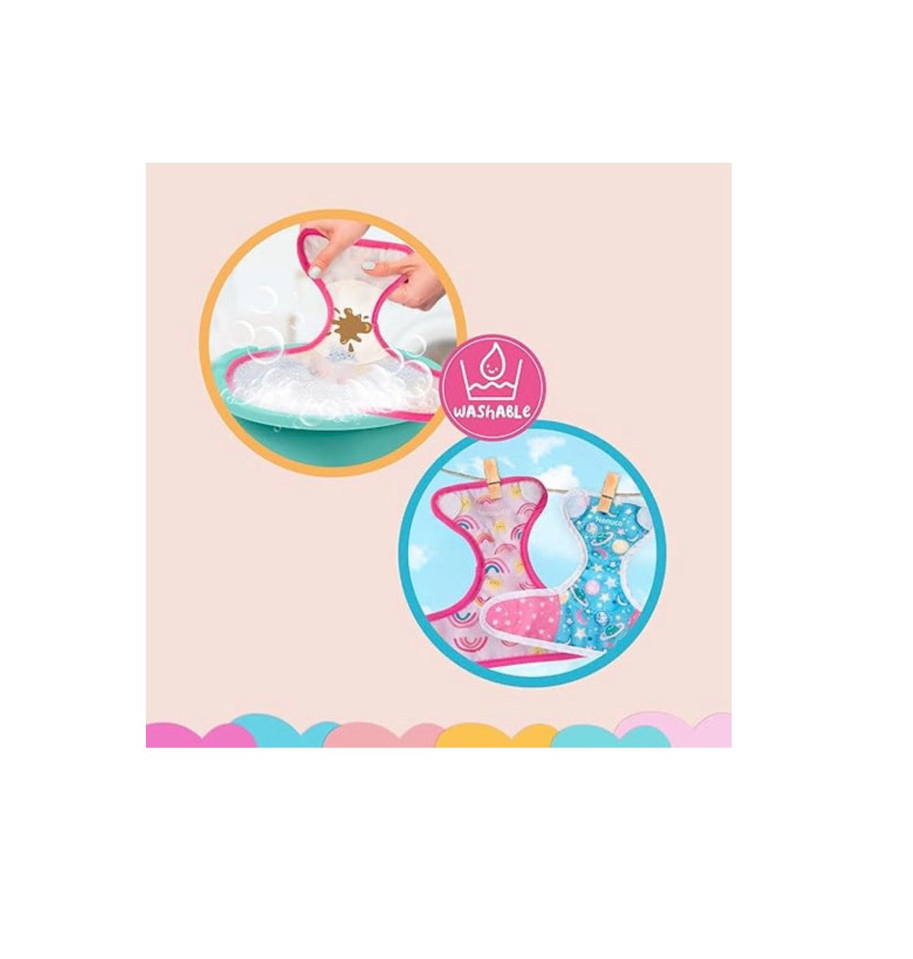Include due pannolini lavabili e riutilizzabili, progettati per la cura dell_ambiente. Uno è ideale per la giornata, e l_altro speciale per la notte, quest_ultimo brilla al buio per renderlo ancora più divertente.