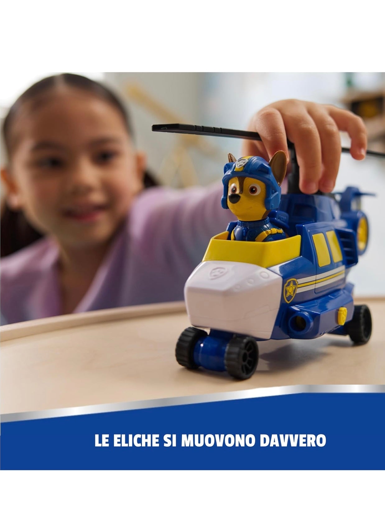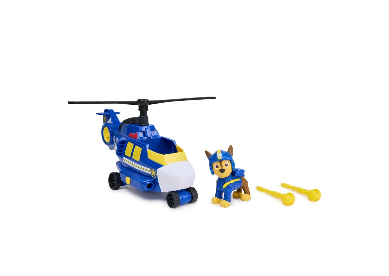 - ELICOTTERO DI SALVATAGGIO PAW PATROL: fissa Chase in posizione e fai girare le eliche, mentre decolli per la tua missione, poi premi il distintivo a forma di zampa sul lanciatore per liberare i proiettili e risolvere la missione