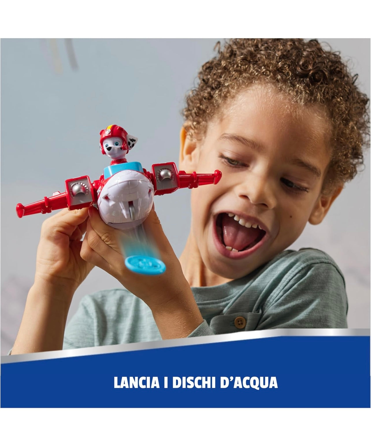 - VEICOLO DI SALVATAGGIO DEI POMPIERI PAW PATROL: fissa Marshall in posizione nella cabina di pilotaggio prima di partire per la missione, quindi premi la leva sulla coda per lanciare i dischi d'acqua