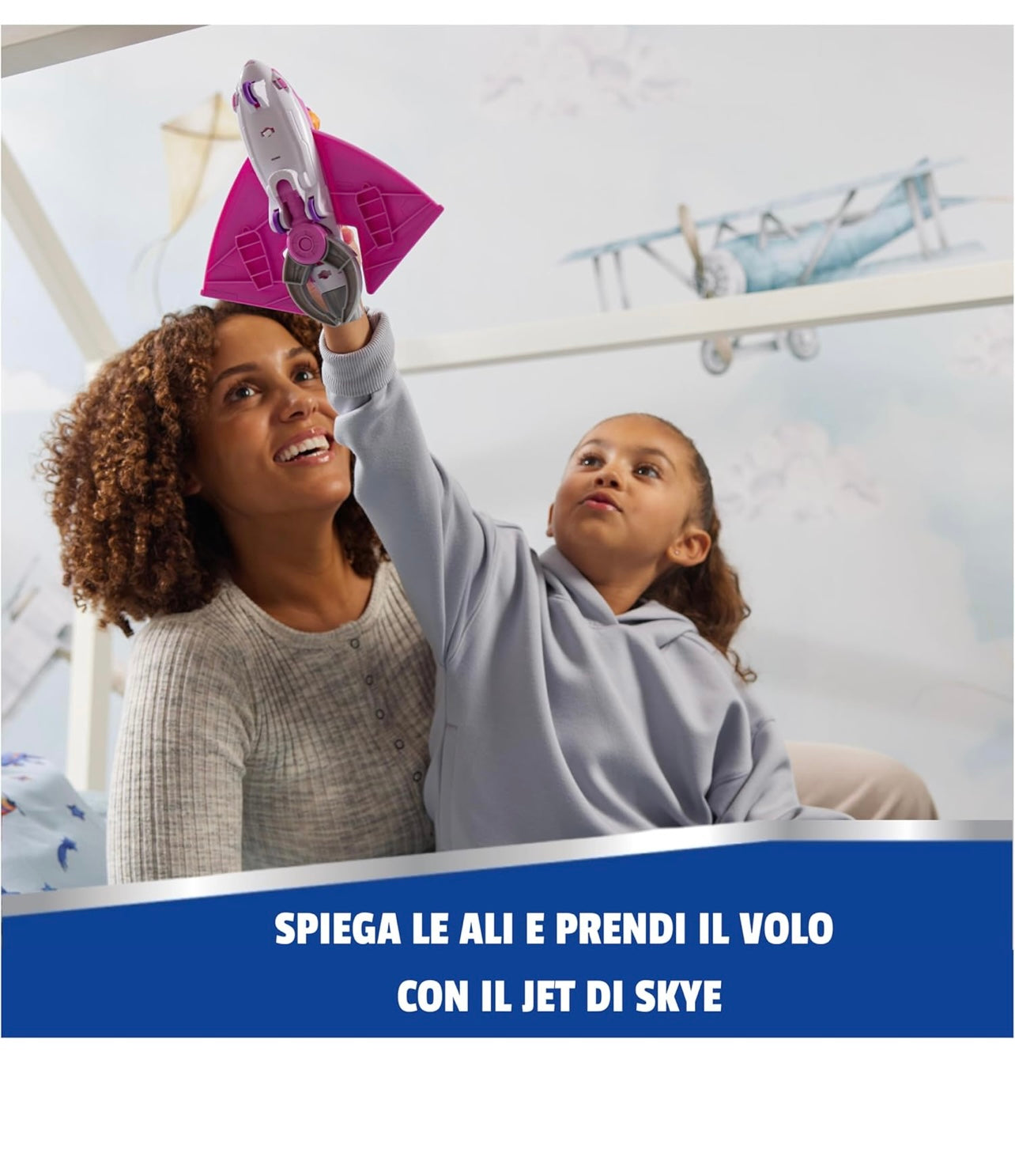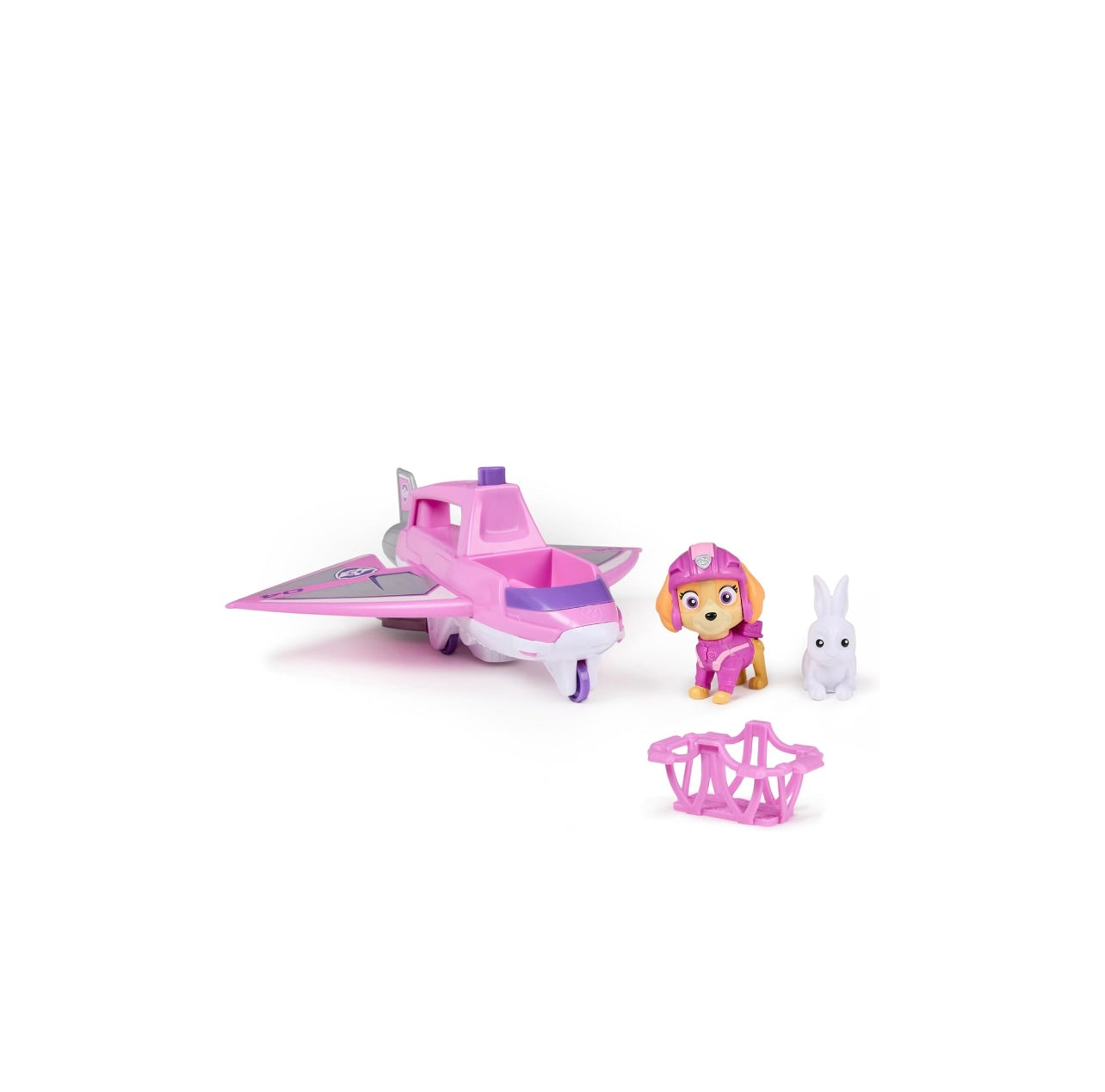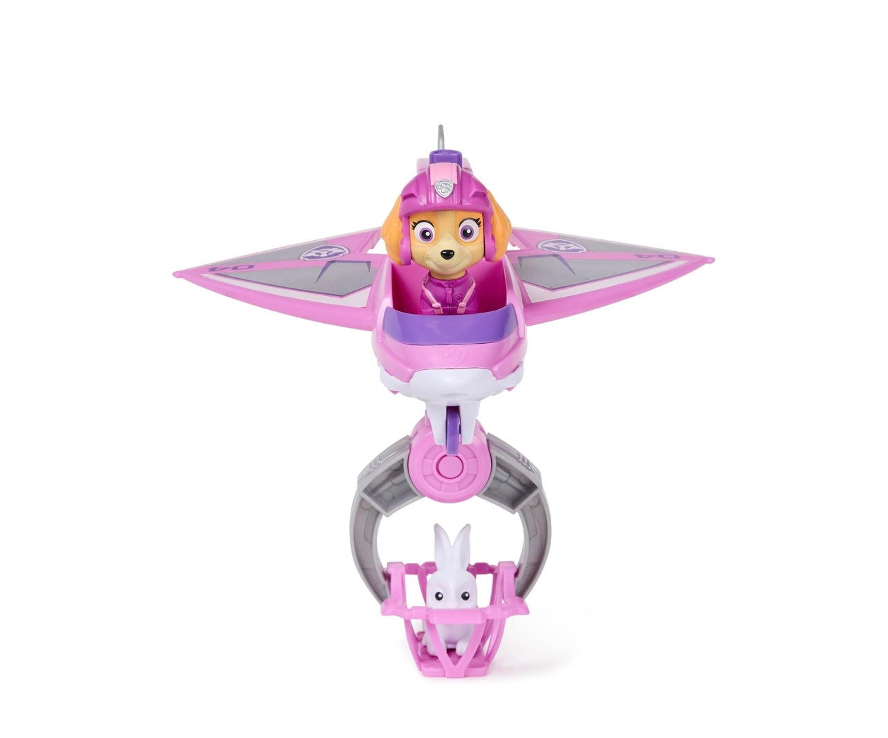 - JET DI SALVATAGGIO PAW PATROL: fissa Skye in posizione nella cabina di pilotaggio prima di partire per la missione, quindi premi il pulsante per allungare il gancio e recuperare il coniglietto con la cesta di salvataggio
