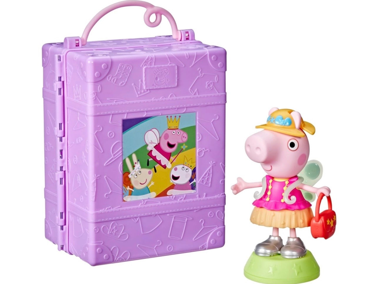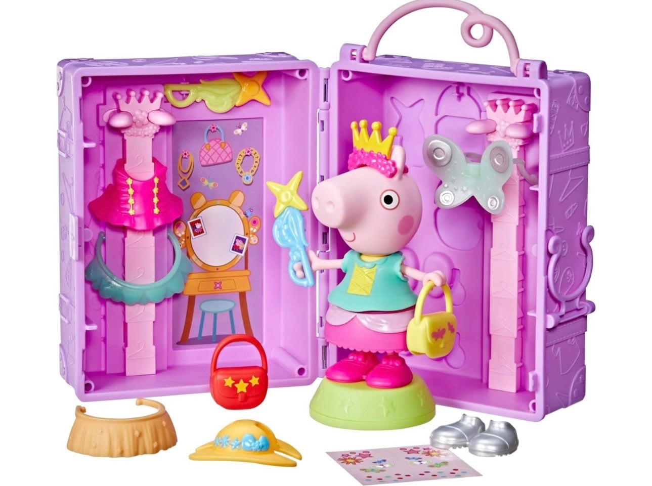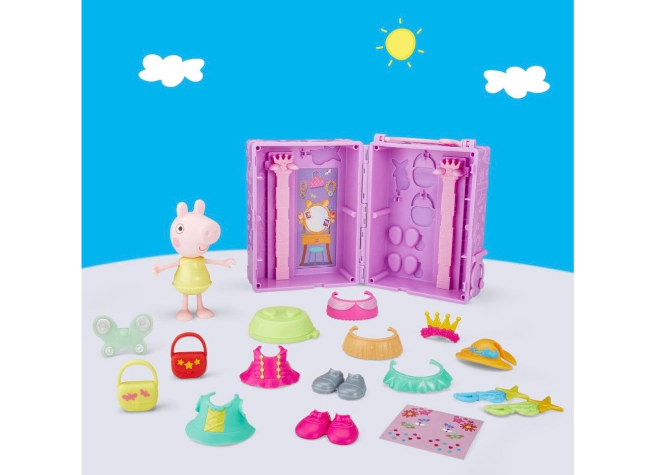 Scambia e combina accessori come ali di fata, bacchette, una corona, un cappello da mare, un tutù e tanto altro per creare outfit fantastici e fashion! Usa gli adesivi per decorare la bambola di Peppa ei suoi vestiti.