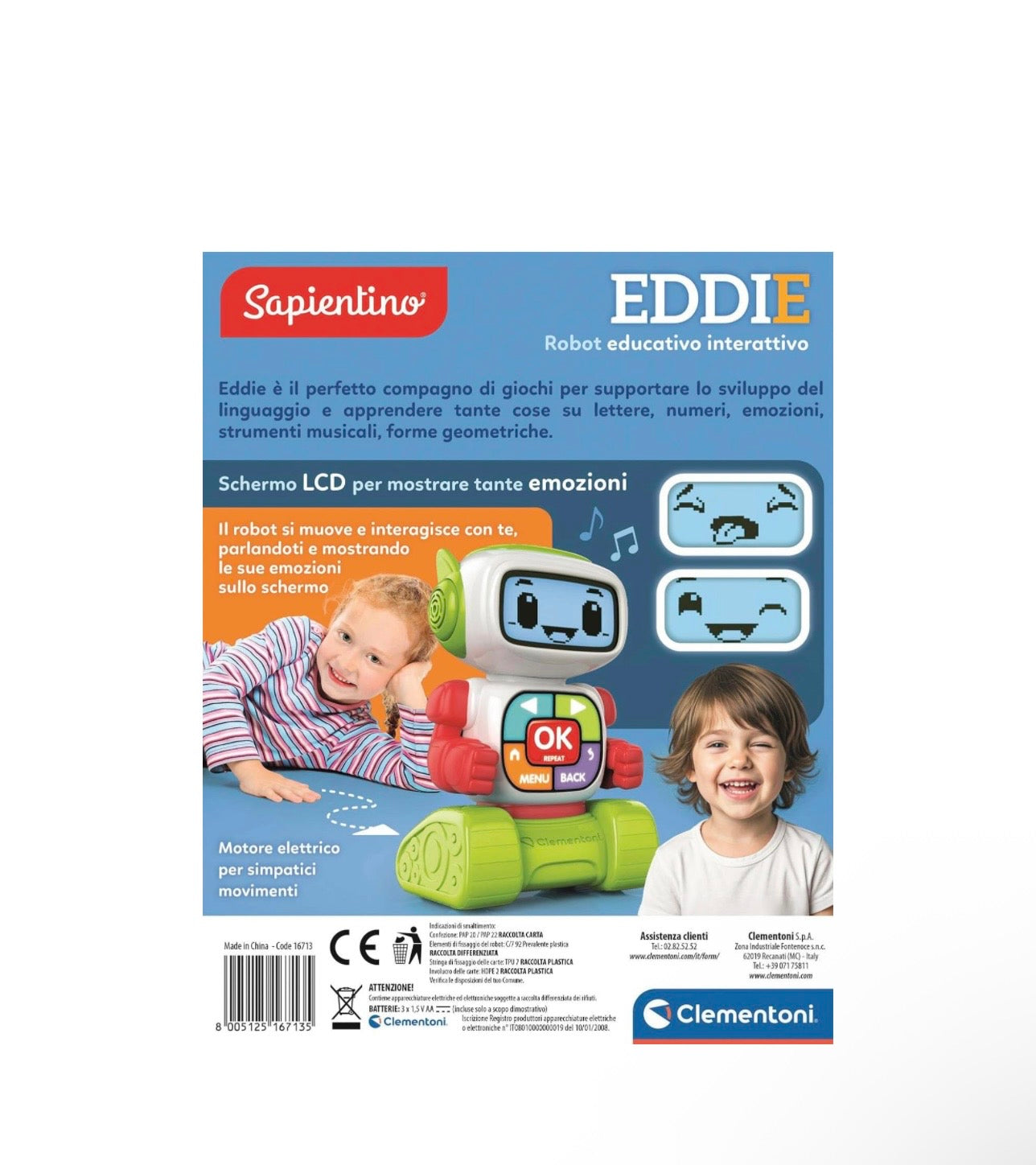 - COSA CONTIENE: gioco educativo Clementoni Made in Italy, adatto per bambini dai 4 ai 6 anni, include 1 robot educativo interattivo con schermo LCD, 30 carte illustrate per attività didattiche e 1 manuale di gioco