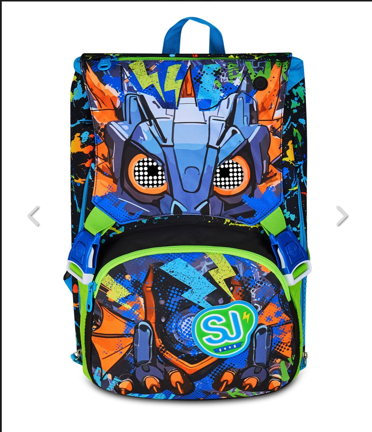 Ciao! Sono LED LOOK, lo zaino estensibile SJ GANG con cui vai a scuola, ma puoi anche giocare. Divertiti ad accendere tutte le volte che vuoi gli OCCHI sulla pattina! Tramite pulsante ON/OFF puoi attivare il dispositivo luminoso con effetto LIGHTING MOVING EYES. Il dispositivo è ricaricabile tramite USB ed è inserito in un pattina staccabile, così lo zaino rimane lavabile. Ho un doppio scomparto spazioso, di cui puoi aumentare facilmente la capienza tramite le zip laterali per poter accogliere e distribuire in modo ottimale libri, quaderni e tutto ciò che ti serve per la tua giornata, potendo sfruttare anche la tasca frontale e la tasca porta borraccia. Inoltre, sono davvero comodo da indossare sulle spalle, grazie a schienale e spallacci confortevoli. In più, il fondo integrato mantiene la mia struttura inalterata, garantendo la stabilità del contenuto anche a pieno carico.