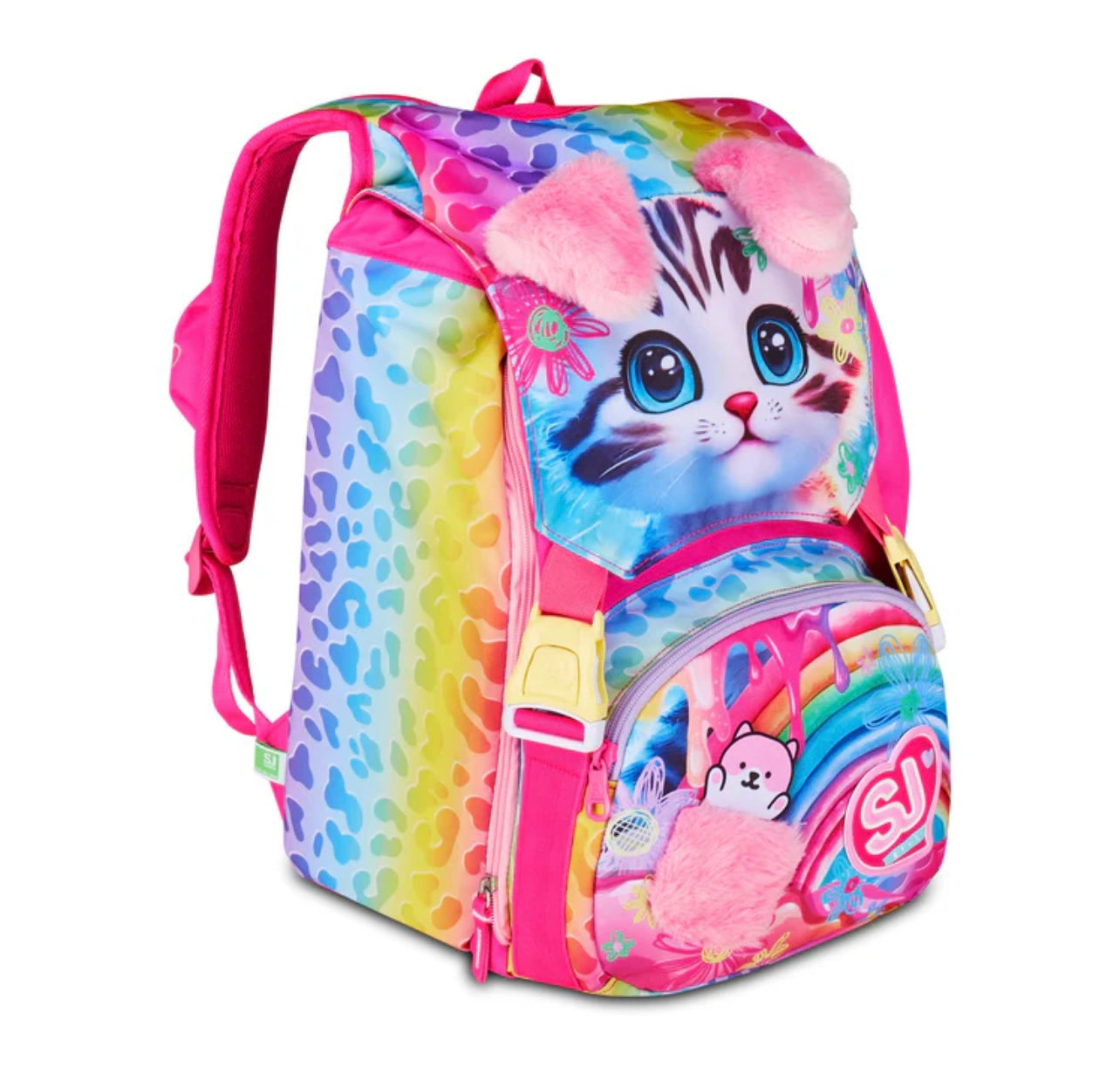 Ciao! Sono CAT&AIR, lo zaino estensibile SJ GANG con cui vai a scuola e con cui puoi giocare facendo sollevare le mie ORECCHIE DI PELUCHE! Ho un doppio scomparto spazioso, di cui puoi aumentare facilmente la capienza tramite le zip laterali per poter accogliere e distribuire in modo ottimale libri, quaderni e tutto ciò che ti serve per la tua giornata, potendo sfruttare anche la tasca frontale con dettaglio taschino e MINI PELUCHE in applicazione. Inoltre, sono davvero comodo da indossare sulle spalle, grazie a schienale e spallacci confortevoli. In più, il fondo integrato mantiene la mia struttura inalterata, garantendo la stabilità del contenuto anche a pieno carico.