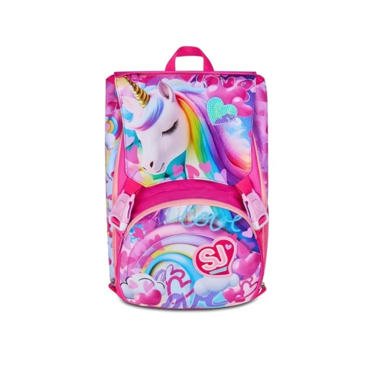 Ciao! Sono FLYUNICORN GIRL, lo zaino estensibile SJ GANG dal CUORE IN PAILLETTES per andare a scuola e giocare! Estrai l'inserzione a forma di ALI da sotto la pattina! Ho un doppio scomparto spazioso, di cui puoi aumentare facilmente la capienza tramite le zip laterali per poter accogliere e distribuire in modo ottimale libri, quaderni e tutto ciò che ti serve per la tua giornata, potendo sfruttare anche la tasca frontale. Inoltre, sono davvero comodo da indossare sulle spalle, grazie a schienale e spallacci confortevoli. In più, il fondo integrato mantiene la mia struttura inalterata, garantendo la stabilità del contenuto anche a pieno carico.